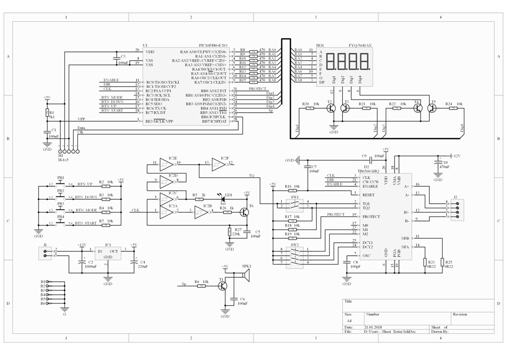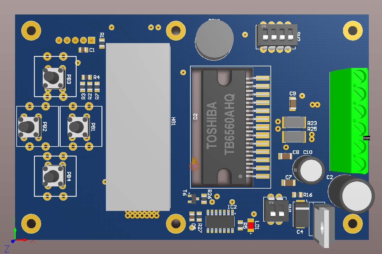 Недавно начал собирать более продвинутый CNC фрезерный станок размером 700x1200мм. На этапе сборки координаты X понял, что подключить быстро шаговый двигатель (ШД) и подвигать портал не получиться. Для этого нужно иметь систему управления, а с ней я еще просто до конца не определился. Поэтому быстро, на досуге за 3 дня, разработал простенький контроллер управления ШД на PIC16F886 и микросхемой TOSHIBA TB6550. TB6550 многие ругают, но я отношусь к нему очень положительно. Ребята! Делайте правильно разводку и никаких проблем с потерей шагов или с выгоранием микросхем не будет! Все возможности для нормальной работы ШД есть, напряжение до 50В, ток до 5А, частота до 200кГц. Не так уж и плохо! Из реальных недостатков – отсутствие режима ¼ микрошага и неполная система защиты от короткого замыкания (КЗ) . Сам являюсь педантом при монтаже, поэтому КЗ у меня бывают крайне редко. Теперь насчет того, что нельзя крутить ШД при подключенном контроллере. Сколько я не крутил его, контроллер убить так и не смог. Может это проблема некоторых ШД с большой индуктивностью обмоток?