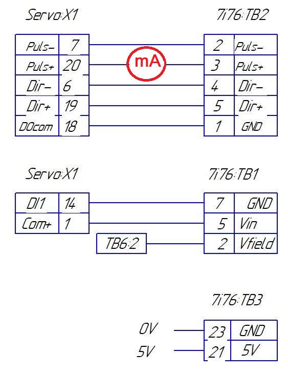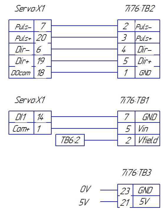 Step и Dir подключены правильно, согласно докам на 7i76 и на серводрайвер.aftaev писал(а):Не правильно подключились к плате Mesa. Нужно читать мануал на Mesa.
