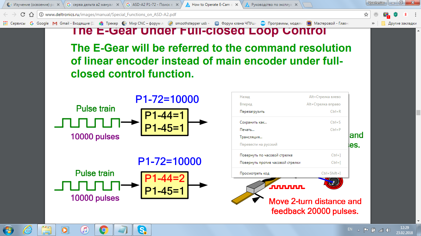 1. На один оборот мотора внешняя линейка (энкодер) выдаёт 10000 импульсов (P1-72). Если электронная редукция 1:1, то при подаче на вход привода 10000 импульсов мотор сделает один оборот, а линейка сдвинется на дистанцию Х и выдаст 10000 импульсов согласно P1-72.