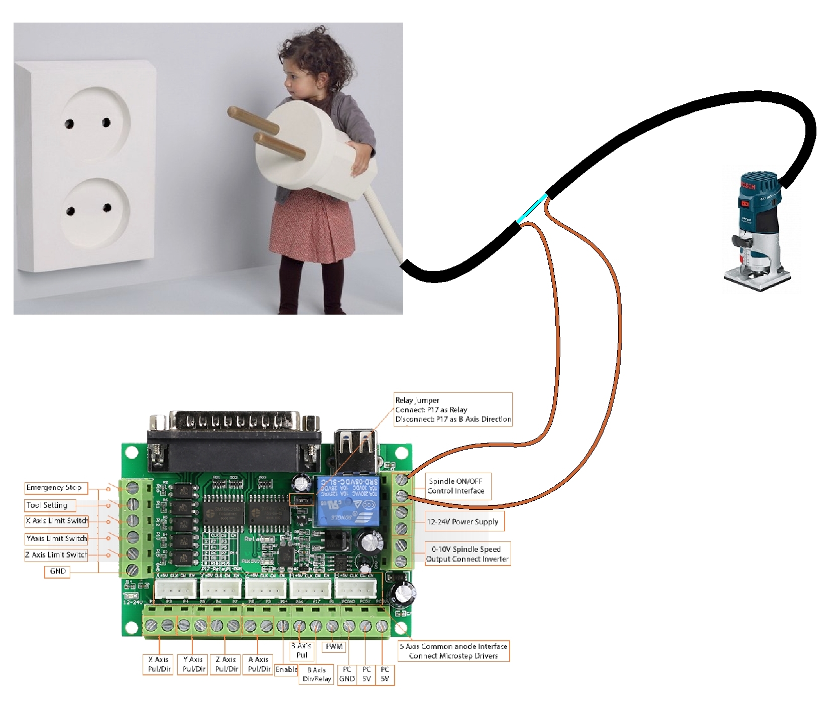 Помогите с подключением обычного фрезера к плате управления чпу, есть плата tb6600 как сделать так, что бы включение и отключение фрезера управлялось платой, может через реле как-нибудь, буду благодарен если объясните как чайнику (в электрике дуб дубом) а плату спалить ой как не охото) фрезер bosh gkf 600 питание от 220в