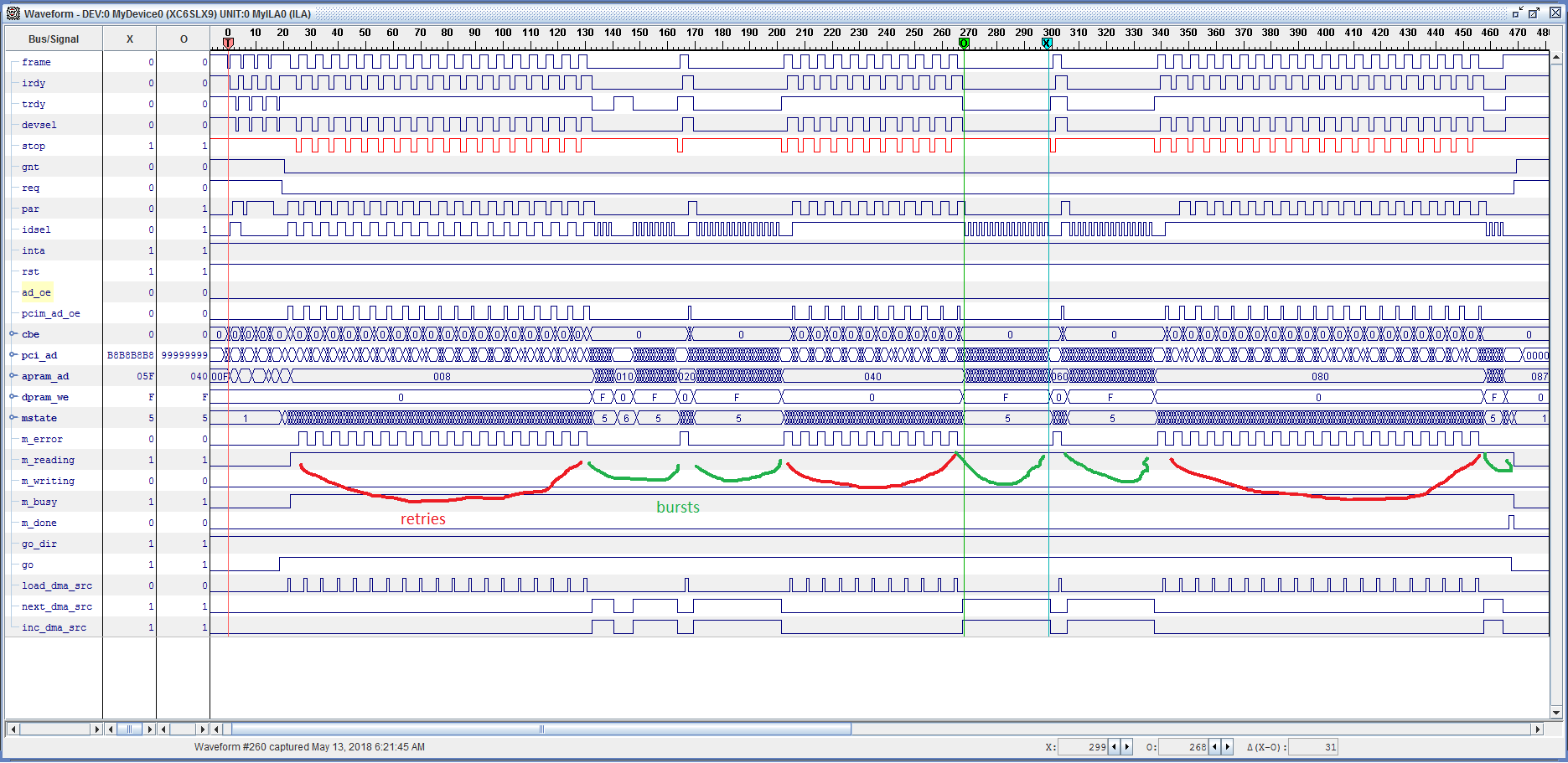 допилил, наконец, DMA из основной памяти -> в DPRAM контроллера, потестил на разных машинках. на GA-N3150N с AMS1083 PCIe-to-PCI мостом весьма грустная картина, конечно. контроллер->память - все ок, а вот обратно этот мост отменяет с "retry" транзакции чтения по 20 раз прежде чем начнет отдавать данные. из за этого передача 512 байт занимает почти 15 мкс. в 3 раза дольше, чем могла бы...