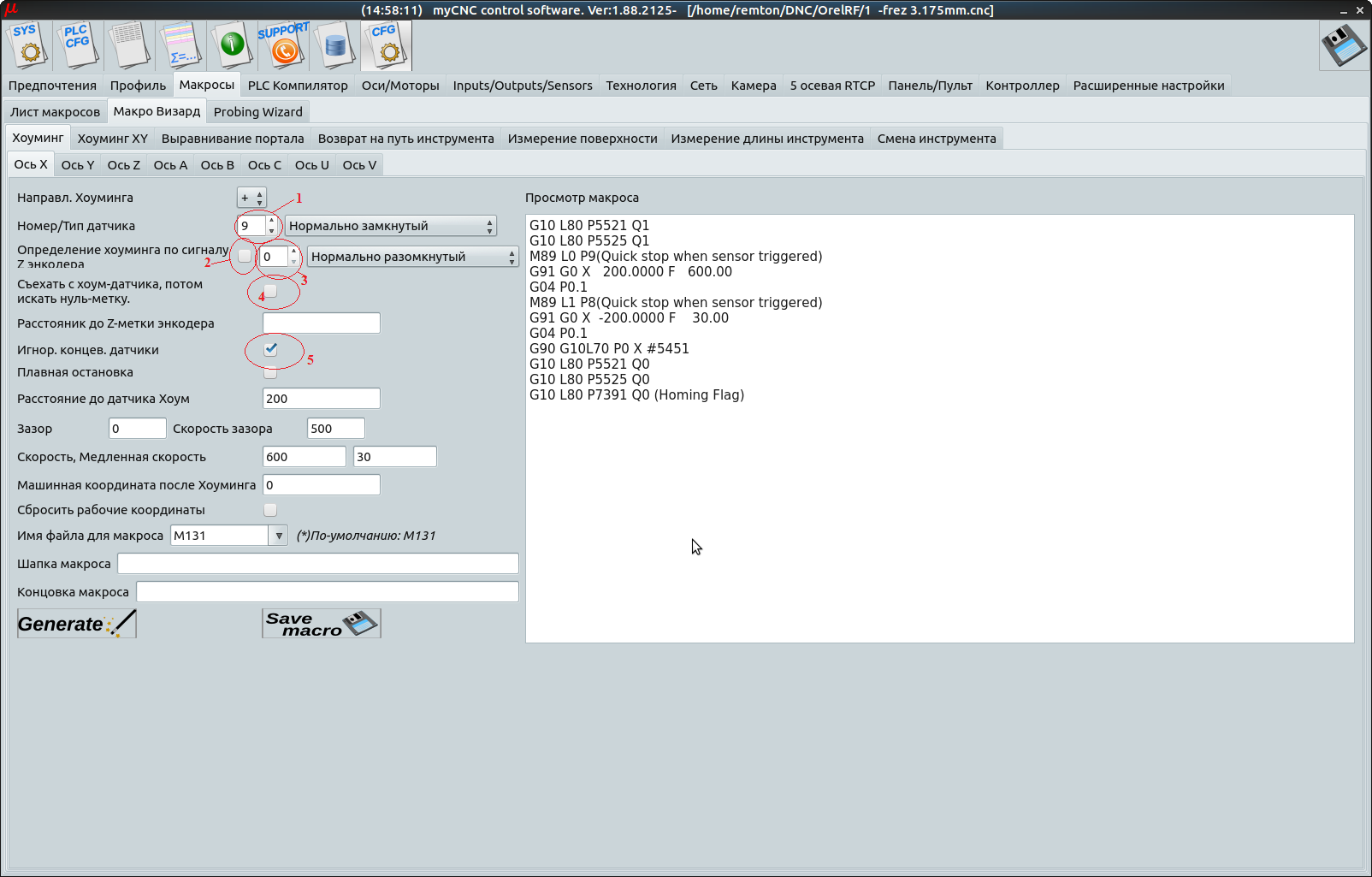 Подобные действия произвести для всех задействованных осей (макросы М131, М132...) и собрать все воедино в макросе М138.