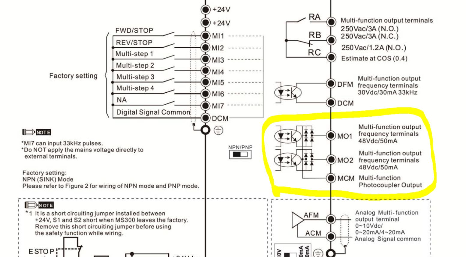 Также есть обведенные на схеме многофункциональные выводы(помечены маркером), их также можно запрограммировать, но я не могу понять логику их работы. Цепь не замыкается, напряжение не подается. Мерил как между MO1/MO2 и MCM, так между MO1/MO2 и землей.