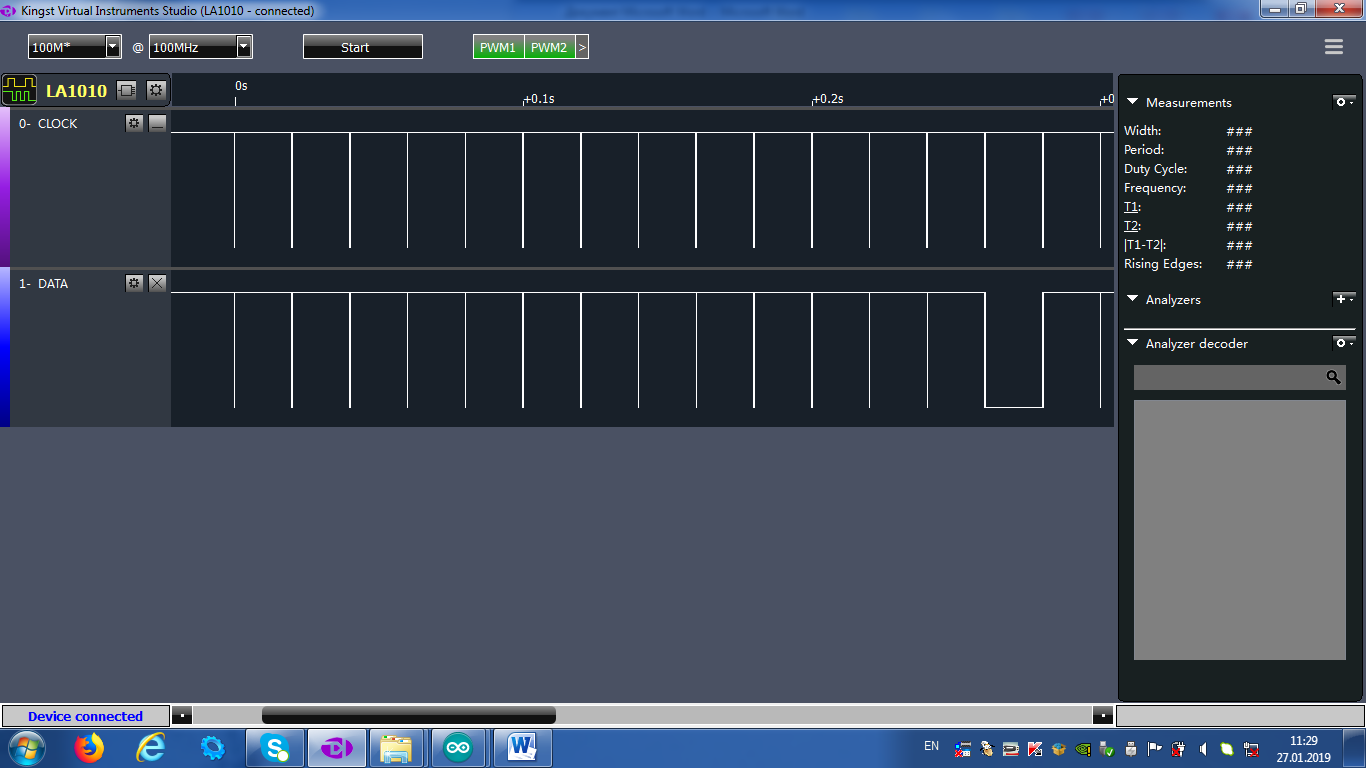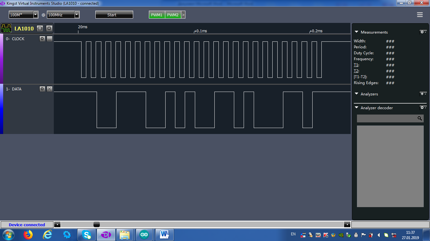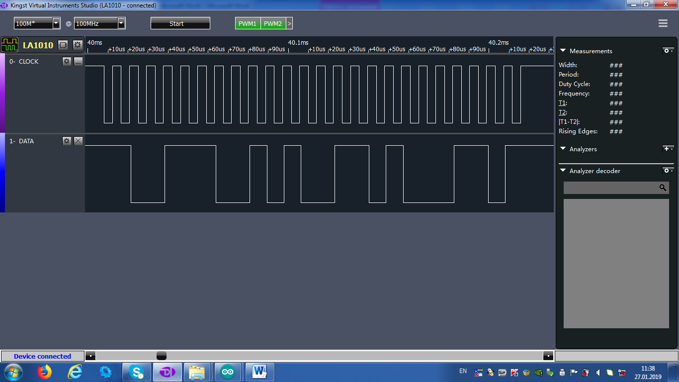 Только “DATA” почему то, в некоторых промежутках между пачками “CLOCK” остаётся в нулевом состоянии до прихода следующей серии “CLOCK”, стабильность не смог проследить.