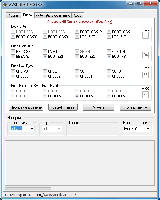 Прошивка подходит любая, фьюзы как на ардуино, вотkoka456 писал(а):какая прошивка к этой плате подходит, и какие фьюзы нужно выставить?