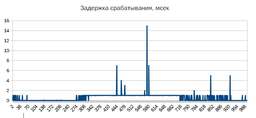 В основном, разброс задержки срабатывания находится в пределах 1 мс (1 период сервоцикла LinuxCNC) . Но есть отдельные выбросы, видимо, из-за помех, достигающие 4-7 мс, и одна задержка на 15 мс.