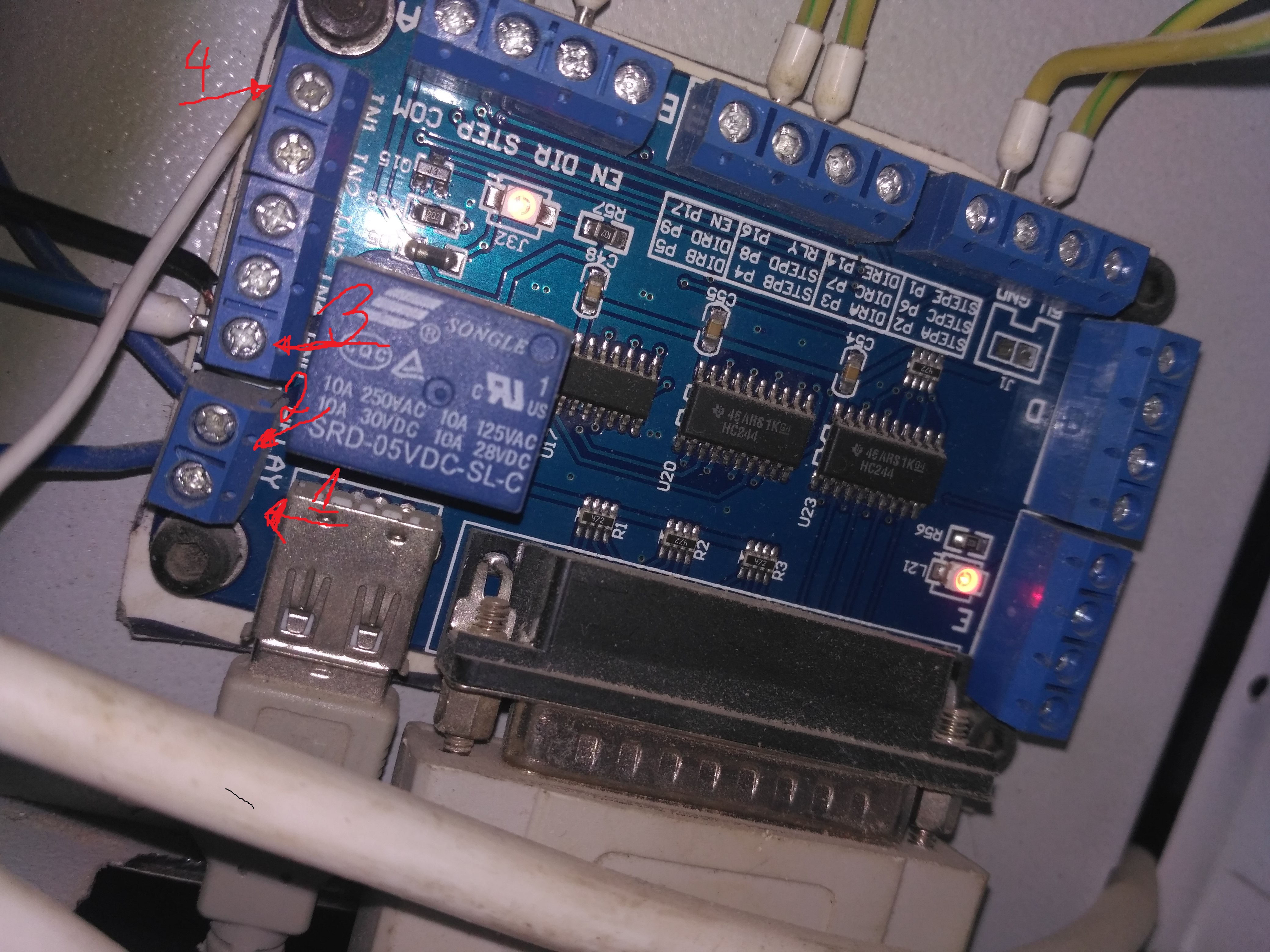 Открути провод 3 и проверь (прозвони) наличие связи между клеммой 3 и клеммой COM на разъеме, куда подключен шаговый драйвер (Step-Dir). Выключи питание платы перед этим (5В)