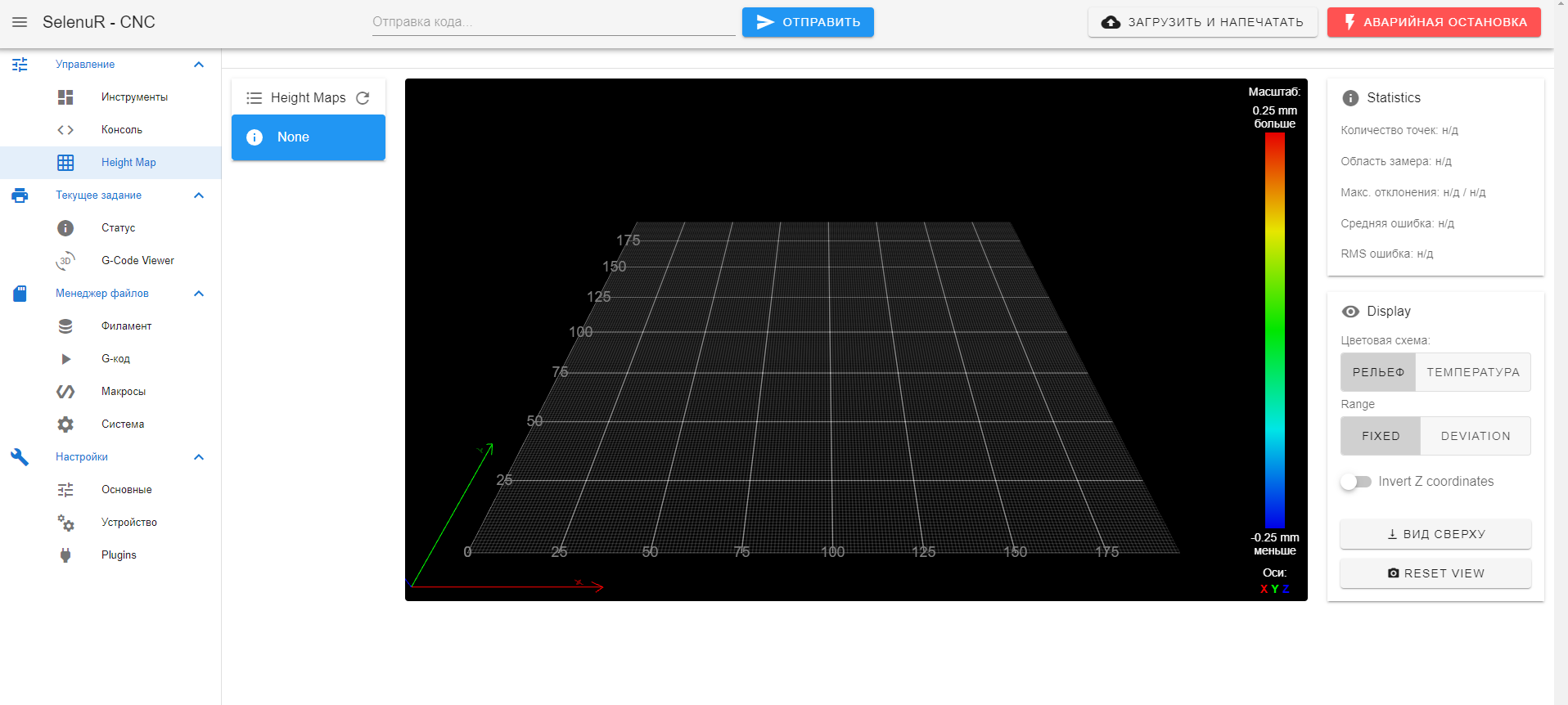 Имеется возможность сканирования поверхности стола, составления карты высот, с последующим сохранением в csv файл на SD-карту.