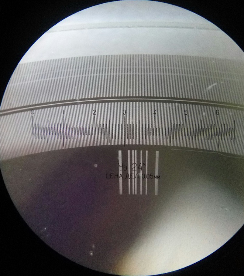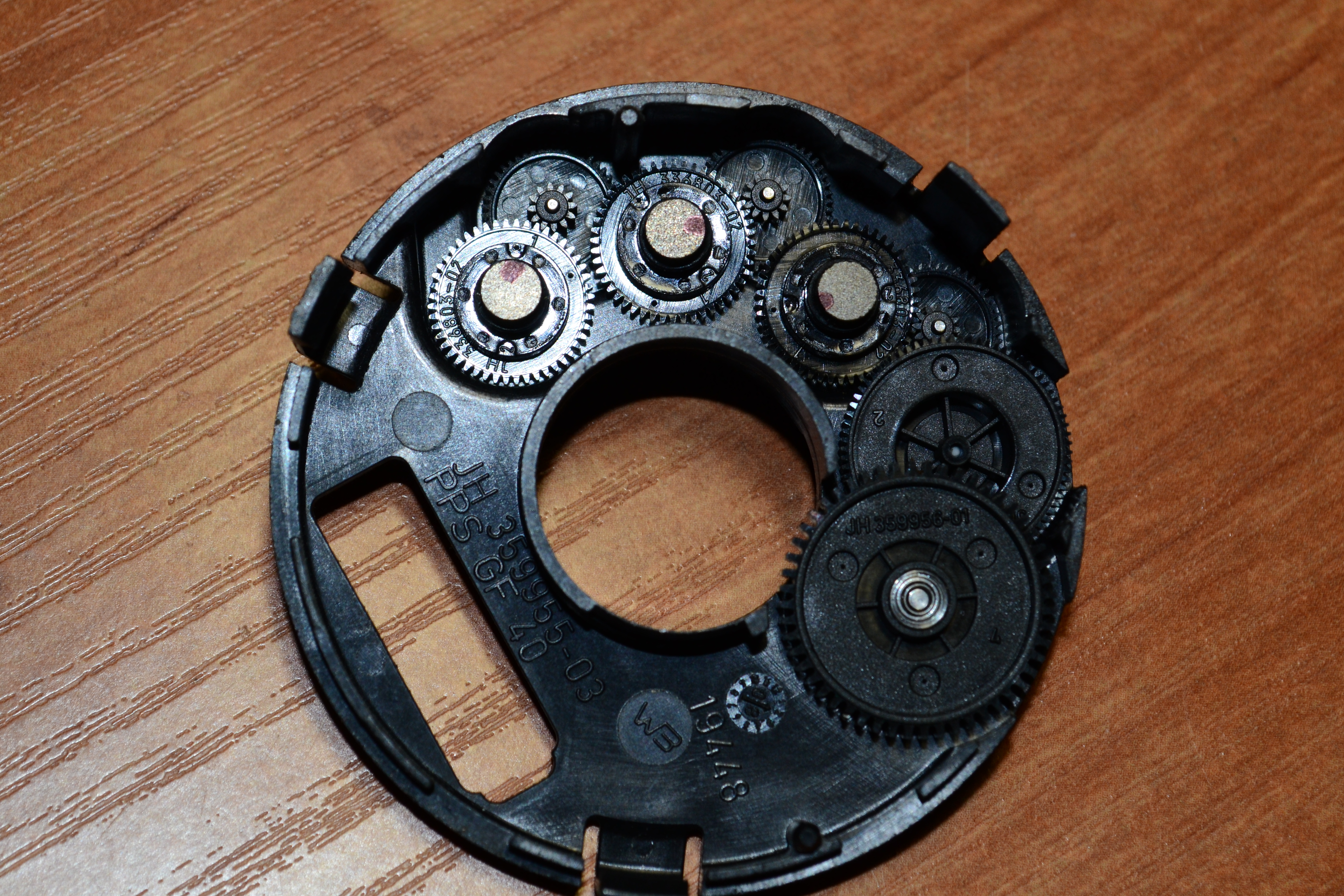 Общий вид: Под крышкой редуктор с магнитами счетчика оборотов: Ориентация магнитов считывается магнитными энкодерами (многоногие микросхемы): Ну а под платой собственно стекло: Под стеклом виден осветитель. Он светит через диск на матрицу фотоэлементов, которые считывают метки. При ударе вал сместился в осевом направлении и при вращении часть меток стерлась о компаунд, которым залита матрица