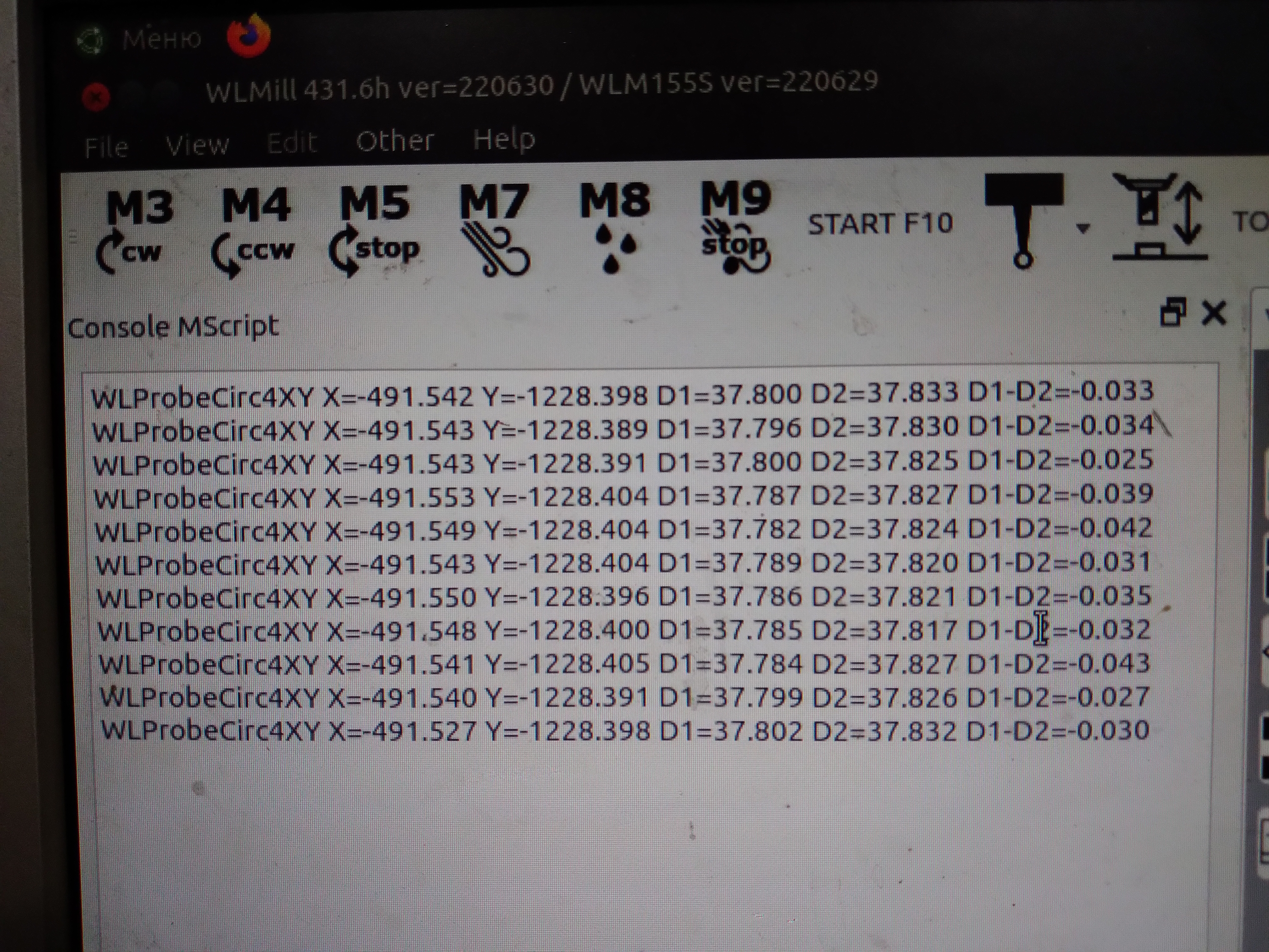 Тесты делались в WLmill, там есть специальная консоль отображения полученных данных. В каждом ряду первые 2 цифры по XY - это смещения найденного центра относительно машинных нулей станка