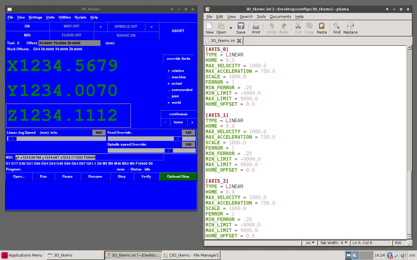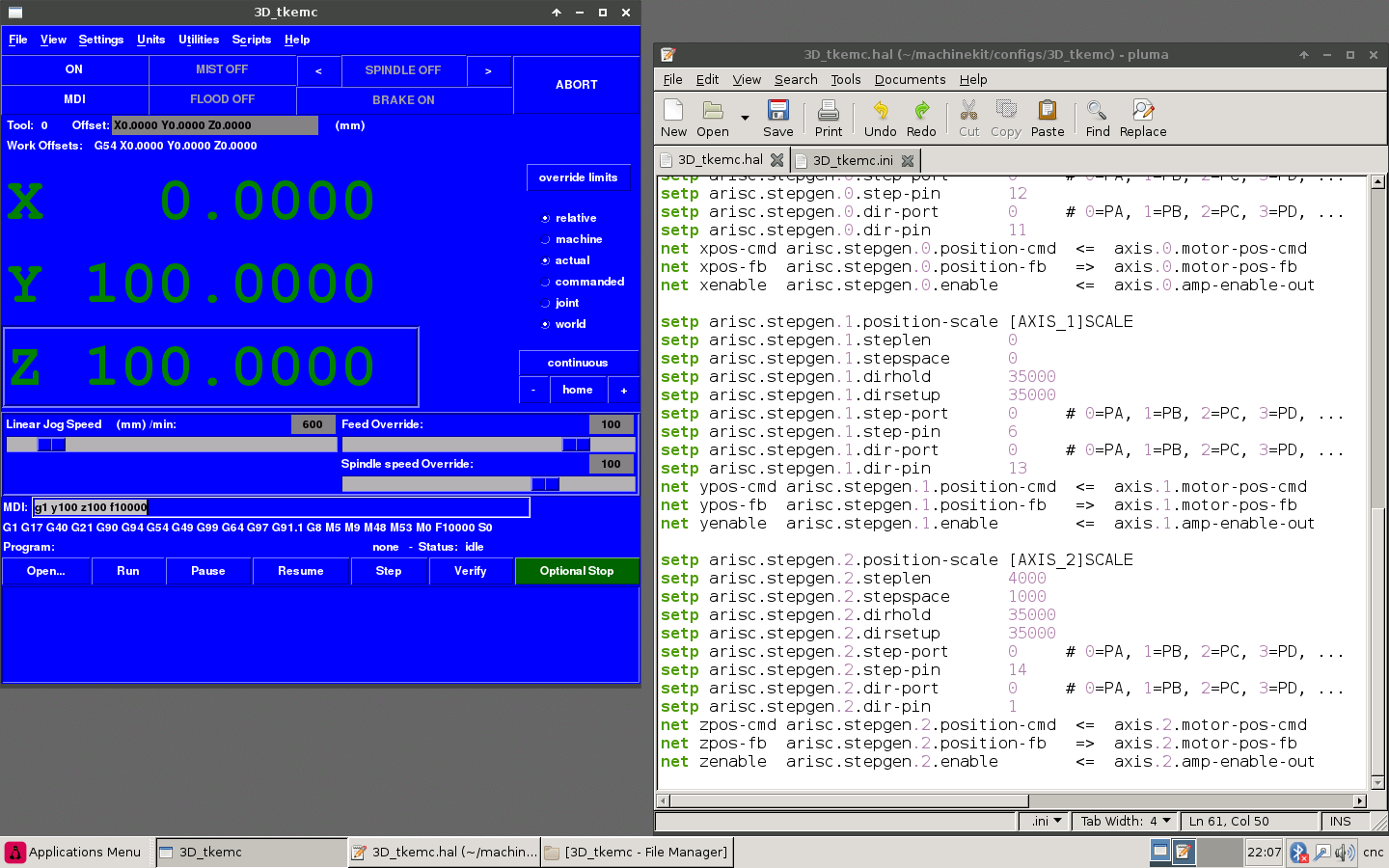 На рабочем столе появятся 4 ссылки. Все файлы тестовых конфигов лежат в папке юзера machinekit/configs/ARISC. Для тех, кому нужен поиск дома по концевикам, раскомментируйте в INI файле все строки вида HOME_ и внесите там свои настройки.