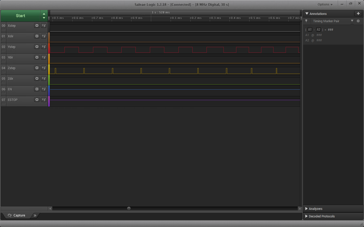 Добавил в драйвер arisc.stepgen интересную функцию управления скважностью STEP сигнала. Если какой-то из параметров steplen/stepspace равен нулю, то скважность будет всегда 50%. В данном примере для оси Z параметры steplen/stepspace = 4000/1000. А для оси Y они равны нулю, поэтому используется динамическая длина сигнала STEP. На осциллограмме это выглядит примерно вот так