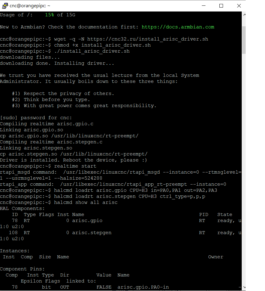 Итак, для быстрой установки свежего arisc драйвера в систему, подключите апельсин к инету, закройте все копии Machinekit (если он работает) и выполните следующие команды в консоли. Если где-то попросит пароль, введите пароль текущего юзера