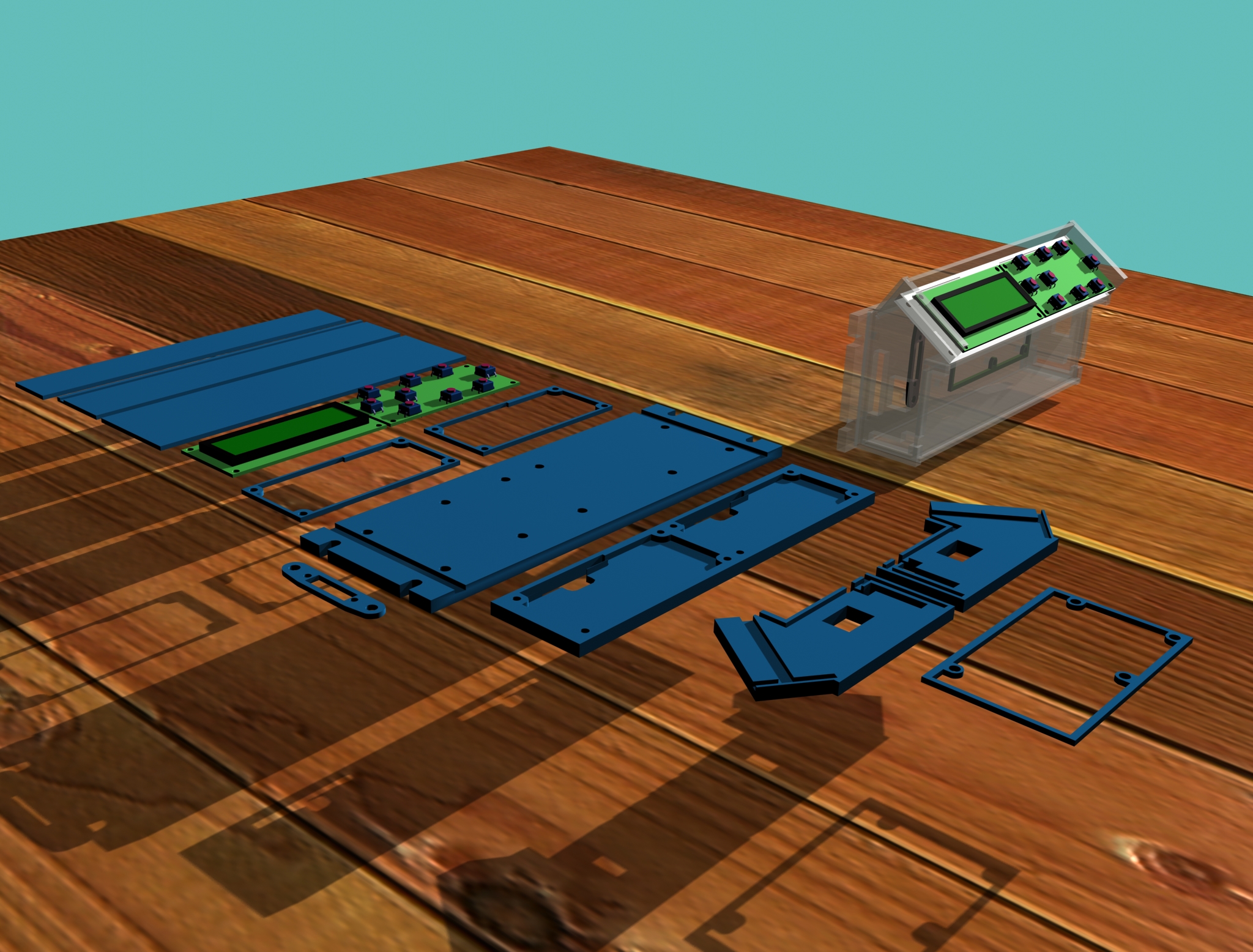 корпус делал из акрила (оргстекла) толщиной 5мм, лицевые крышки из 2мм, так как они вставляются в пазы, есть еще декоративная панель, я ее не прорисовал здесь, но она есть в чертежах, её толщина 9мм, кнопки из пластика 2.5мм.