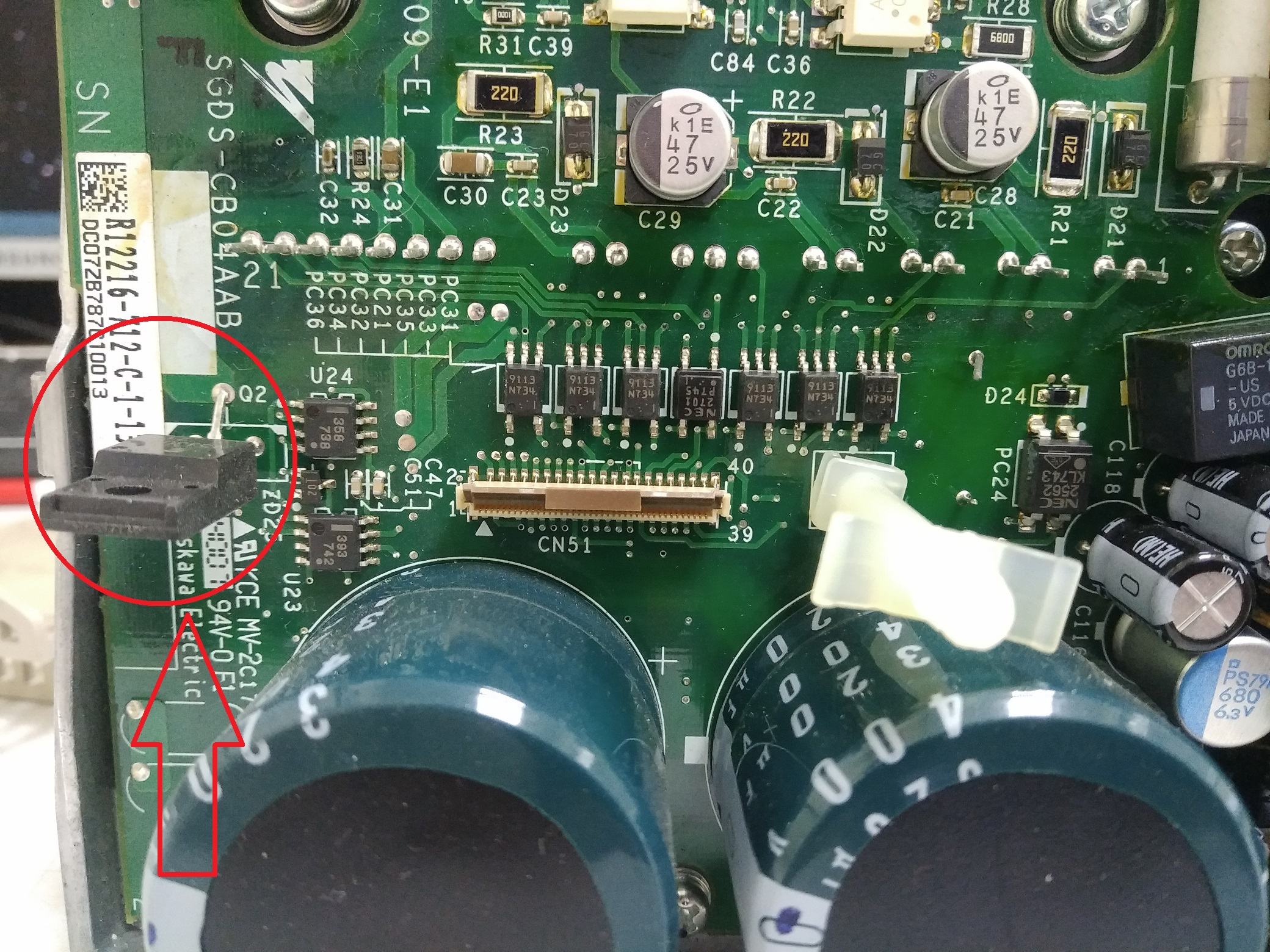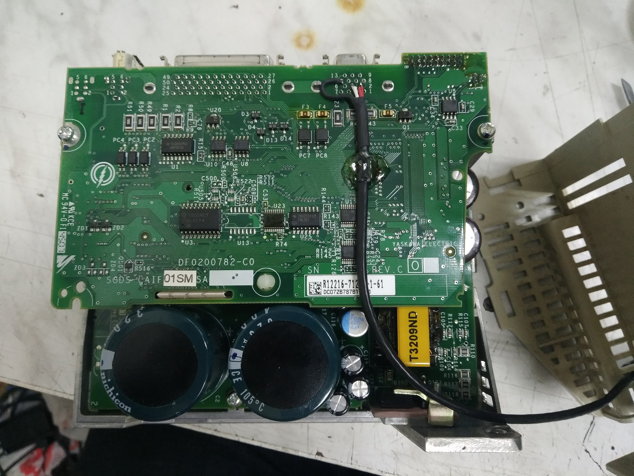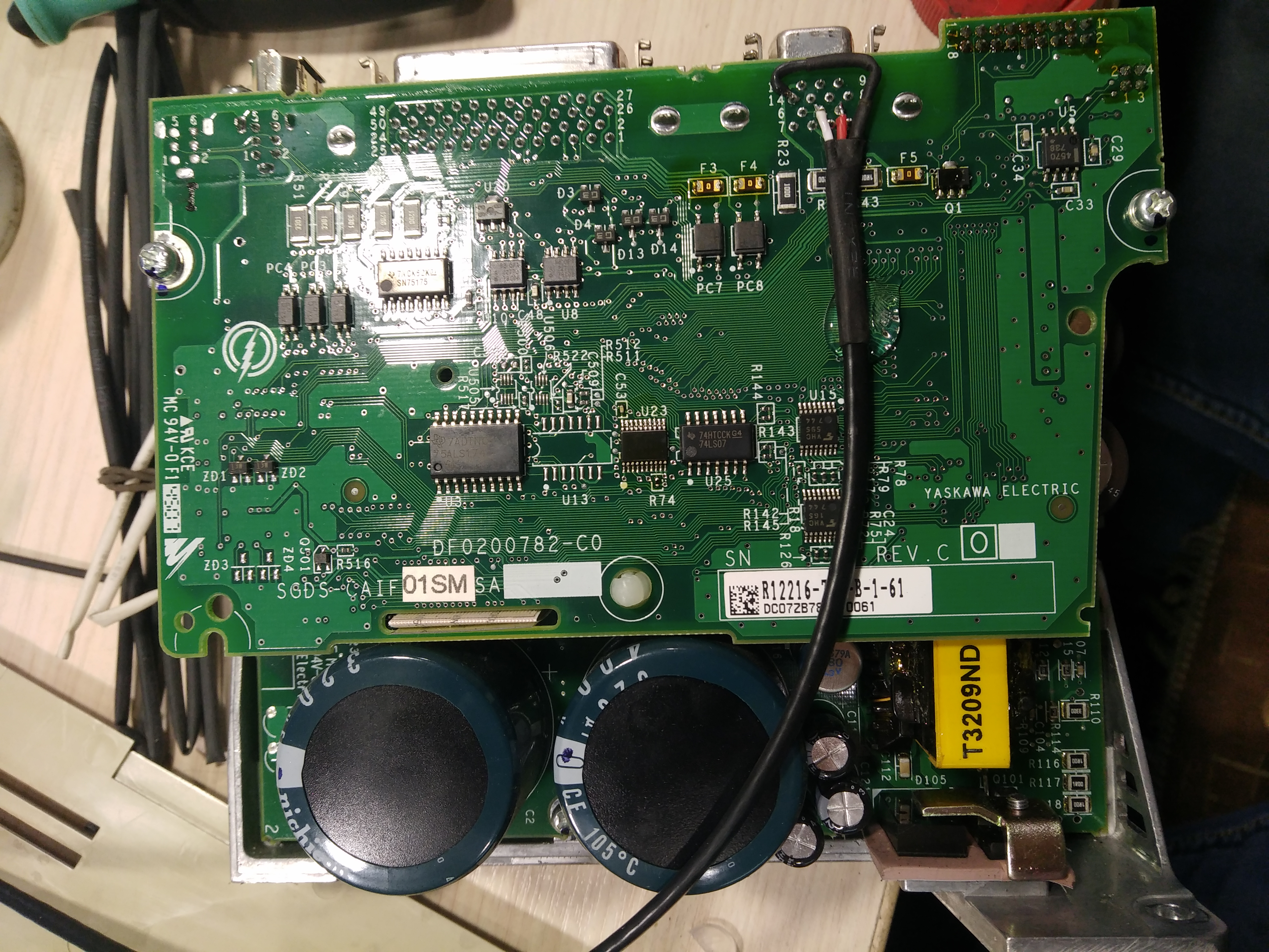 Приобрел указанный привод и решил для настройки подключить к компу, чтоб воспользоваться программой SigmaWin+ и ее автотюнингом. Так как разьема CN3 для подключения к компу у нас в городе нет и в помине, а заказывать с Китая - долго, решил подпаяться к разъему на плате и вывести вменяемый разъемчик: Для этого открыл корпус (там 3 защелки) и согласно распиновки с мануала кинул 3 проводка: Собрал. Подключил питание и перемычку вместо тормозного резистора. Подключил к компу и включил в сеть.