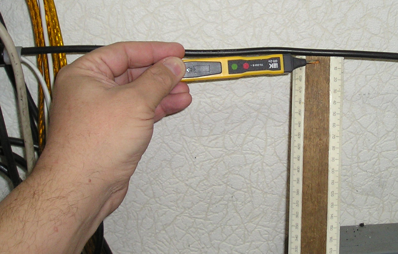 По линейке определяем расстояние, на котором происходит срабатывание. Где-то 160-170 мм от кабеля.