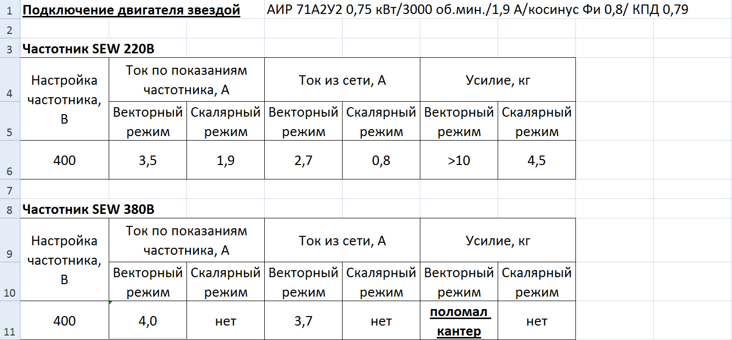 Итак, получены результаты тестов частотников SEW MC07A 0,75 кВт/220В и SEW MD60A 5,5 кВт/380В .