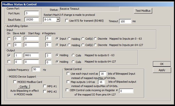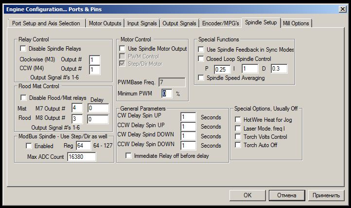 На форуме cnczone.ru есть способ настройки - прописыванием скриптов, но данный метод имеет один существенный недостаток, который мне не удалось победить, а именно Mach не хотел управлять шпинделем с помощью экранных кнопок и клавиатуры, приходилось вводить команды вручную, поэтому был избран немного другой способ.