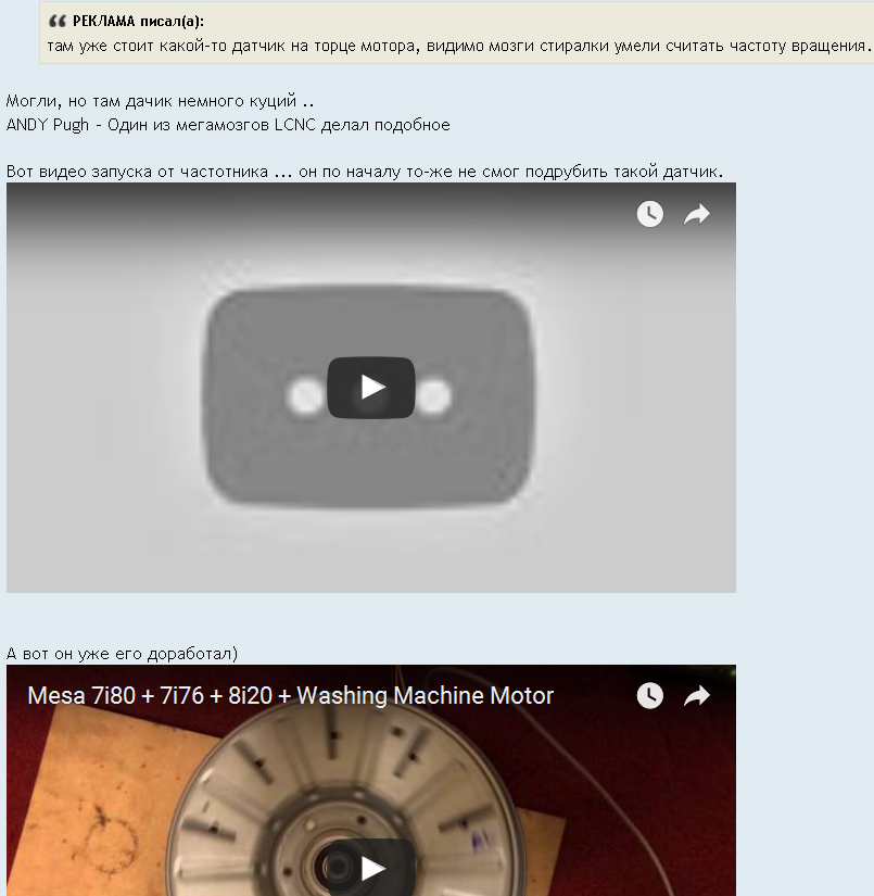 РЕКЛАМА писал(а):Если найдете частотник, то ищите и мотор от стиралки, который не коллекторный.