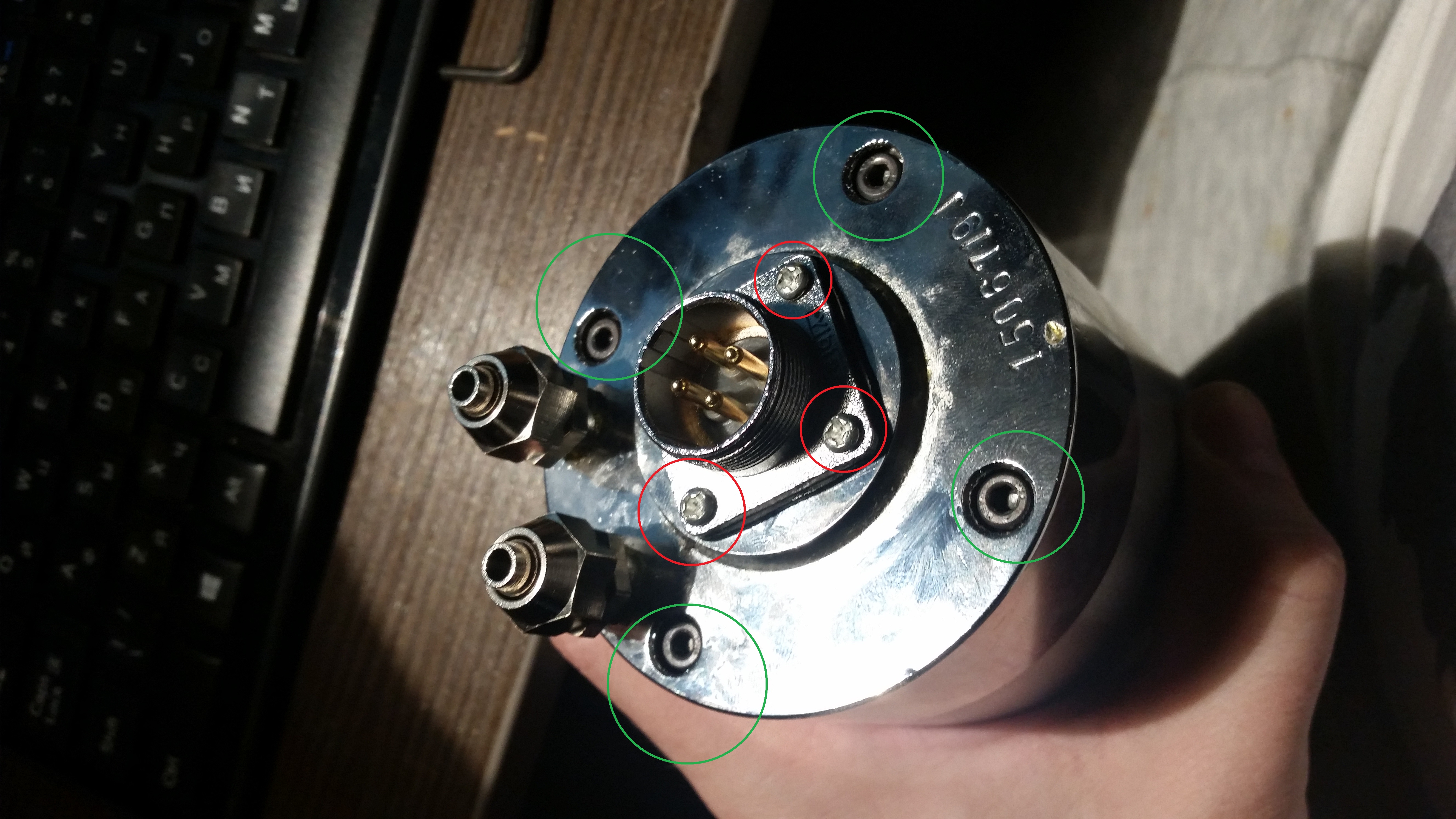 2) Откручиваем 4 шестигранных винта (зеленым обведены). Штуцеры выкручивать не надо!: