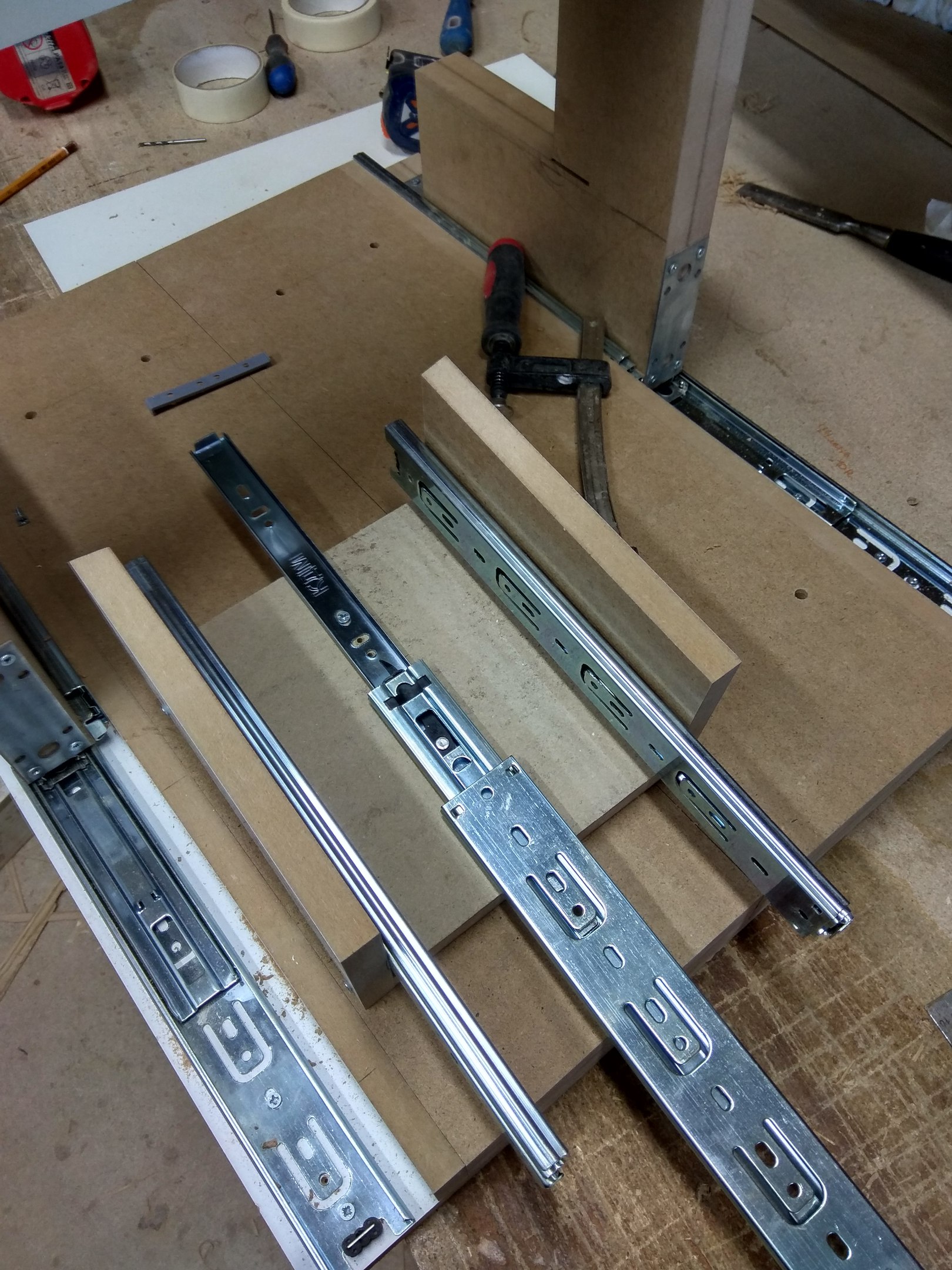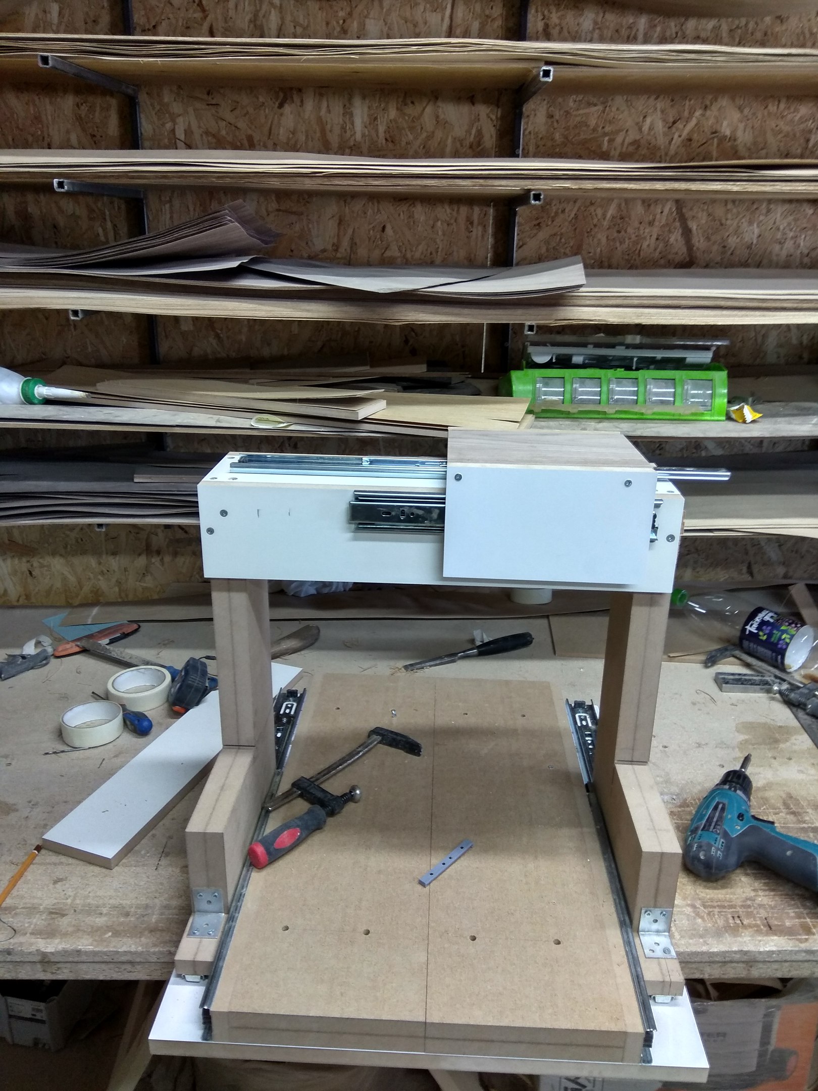 Вот текущая конструкция, третья ось в процессе сборки. Планируемые передачи - трапецеидальные винты с гайками, ход кареток 290+/-мм, винты будут 300мм с шагом 2мм. В данный момент усилие для передвижения портала неравномерное, замерял весами тягая каретки в разные стороны, от 300 до 700\800 грамм. Фрезеровать планирую клееный мдф/массив.