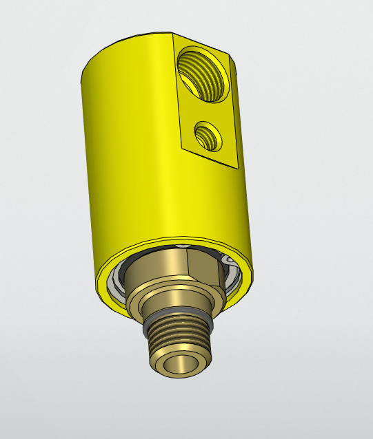 Набросал модельку вращающейся муфты, после установки шпинделя можно будет попробовать, будет оно работать или нет. Принцип такой: вращающаяся муфта имеет дополнительно вход воздуха, перед включением насоса сож за 1-2 секунды включается клапан подачи воздуха в муфту. Давление воздушного затвора регулируется так, чтобы давление воздуха удерживало сож от попадания в зазор между вращающимся валом и неподвижной трубкой. Когда во время обработки(или при смене инструмента для продувки конуса) требуется подача только воздуха, то включается ещё один пневмоклапан, находящийся в цепи другого редуктора, настроенного на другое давление. Теоритически должно работать, но как будет себя вести при колебаниях давления сож на выходе инструмента, покажут опыты.