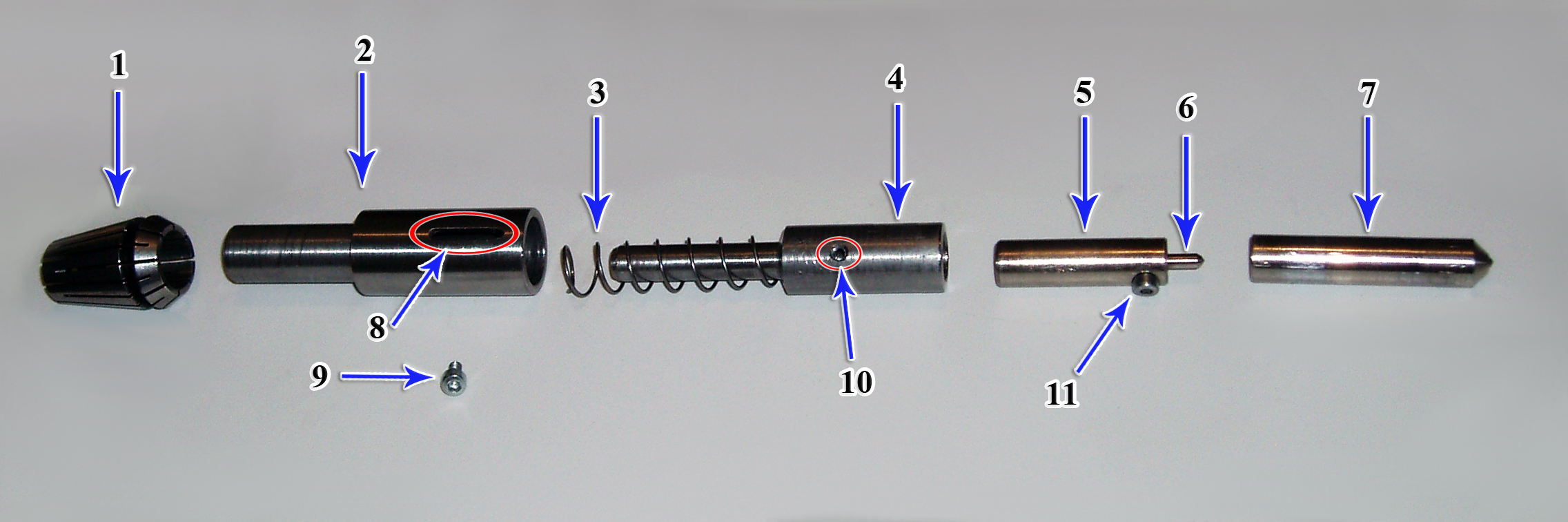 Ограничивает ход нижней части гравера, а так же фиксирует алмазную пику "7" либо переходник "5" в гравере.
