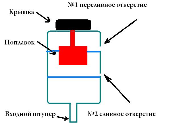 Когда поток воды нормальный вода подымается до верхнего уровня(показано синим) ПОДЫМАЕТ поплавок, замыкат контакты и переливается из двух отверстий №1 и №2.