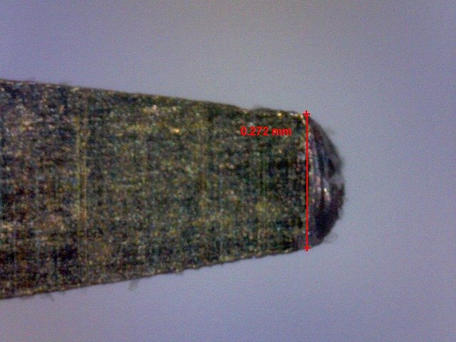 Сделал небольшую платку новым гравером 0.1мм на скорости подачи 1mm/сек. Скорость погружения 0.1мм/сек. Глубина погружения 40микрон. Карта высот использовалась. Исходно кончик инструмента выглядел в микроскоп нормально, а после работы: