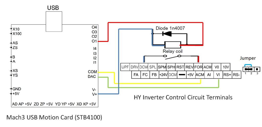 Подключил так : контакты включения шпинделя DCM и FOR через реле, регулировки скорости : VI -> DAC , ACM -> COM