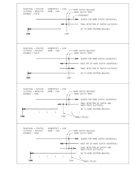 If HOME_SEARCH_VEL is non-zero, then EMC assumes that there is a home switch. It begins by checking whether the home switch is already tripped. If tripped it backs off the switch at HOME_SEARCH_VEL. The direction of the back-off is opposite the sign of HOME_SEARCH_VEL. Then it searches for the home switch by moving in the direction specified by the sign of HOME_SEARCH_VEL, at a speed determined by its absolute value. When the home switch is detected, the joint will stop as fast as possible, but there will always be some overshoot. The amount of overshoot depends on the speed. If it is too high, the joint might overshoot enough to hit a limit switch or crash into the end of travel. On the other hand, if HOME_SEARCH_VEL is too low, homing can take a long time