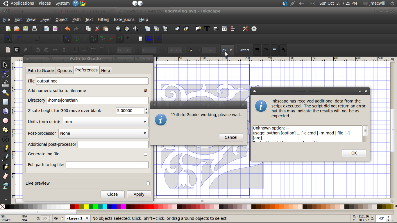 Now you can apply Path to Gcode from Gcode tools to cut this thing out