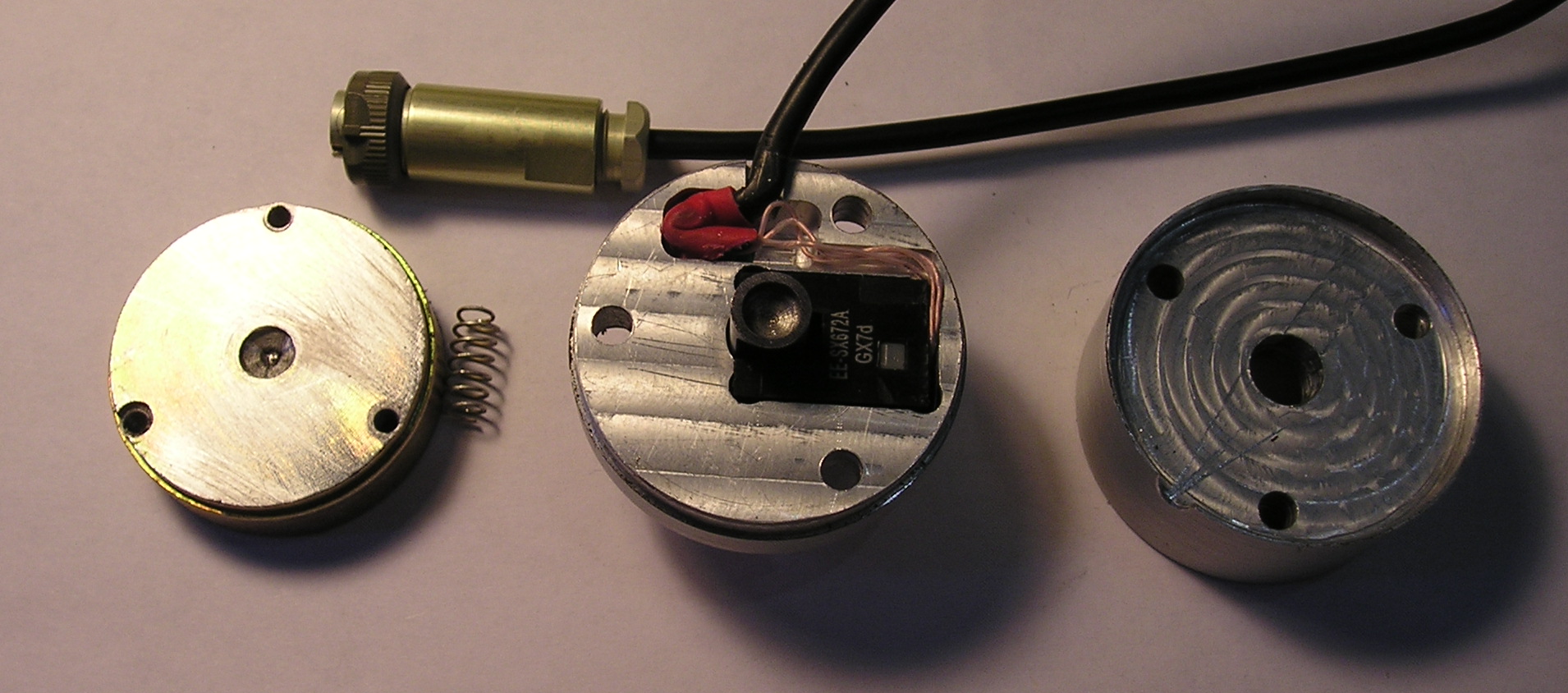 Затем с другой стороны вставляется сам оптодатчик с проводами - там под все это выфрезеровано углубление. Поскольку ширина паза у оптодатчика 6 мм, а диаметр плунжера - 8, на плунжере с двух сторон сделаны лыски.