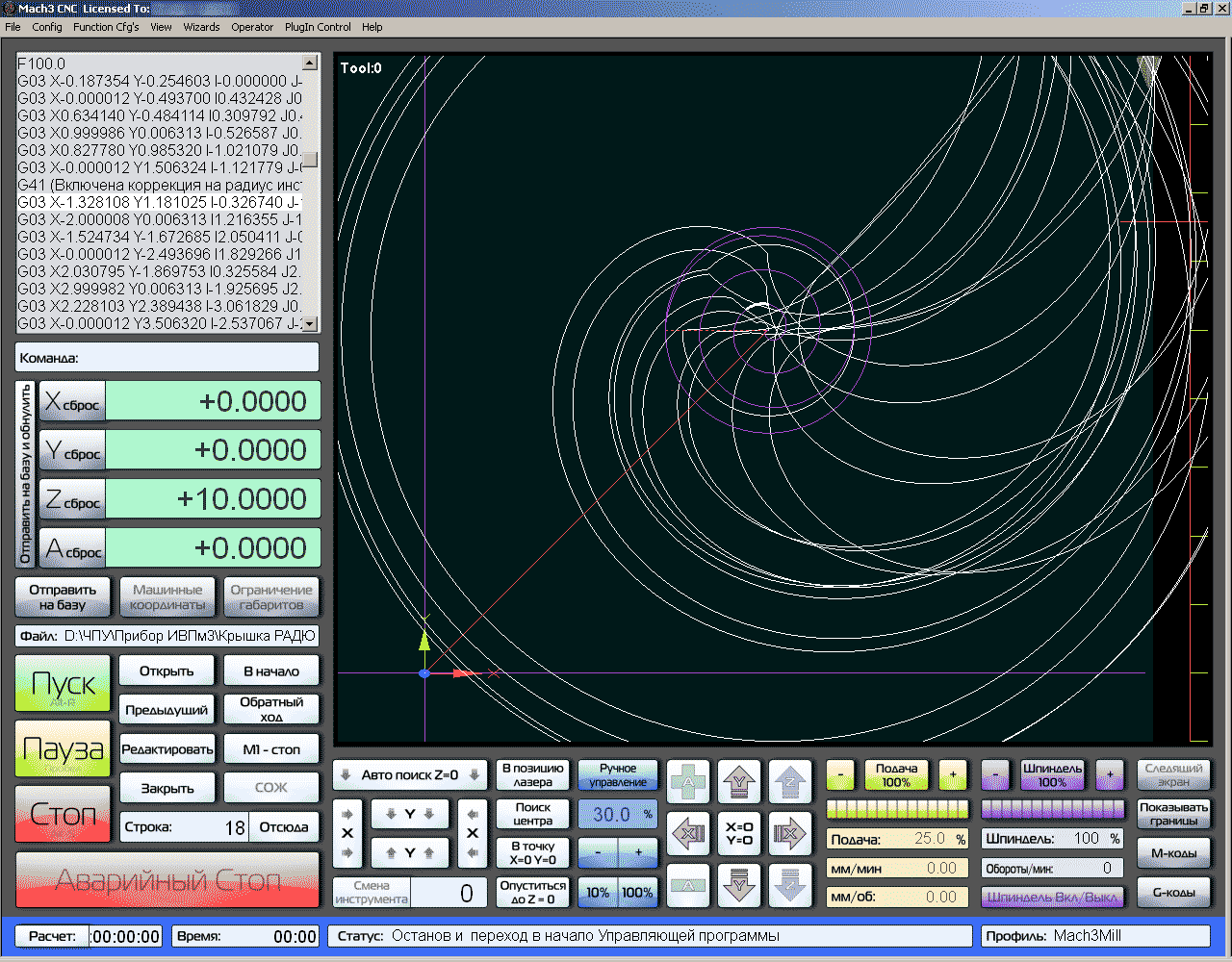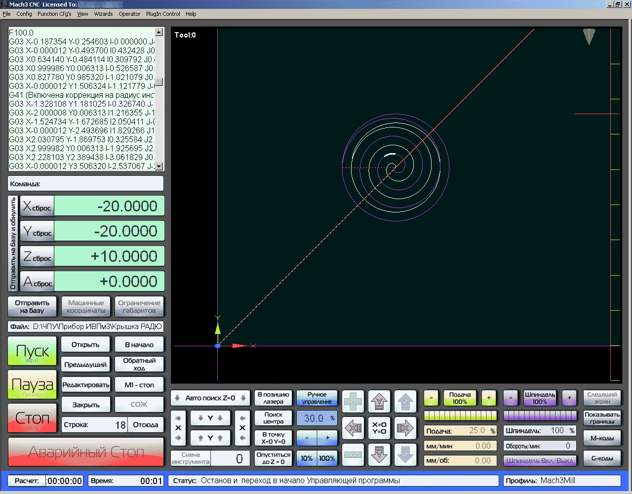 Войдя в редактор, переношу команду G41 на пару строк выше, вызывая тем самым ошибку: Mach3 выдаёт "Сдвиг резца при включённой радиусной коррекции" - т. к. радиус спирали ещё слишком мал. После этого снова вхожу в редактор и возвращаю команду G41 обратно - схема фрезеровки отображается корректно (рис. 3) и остаётся таковой, если, не закрывая Mach3, отрывать и закрывать данную УП.