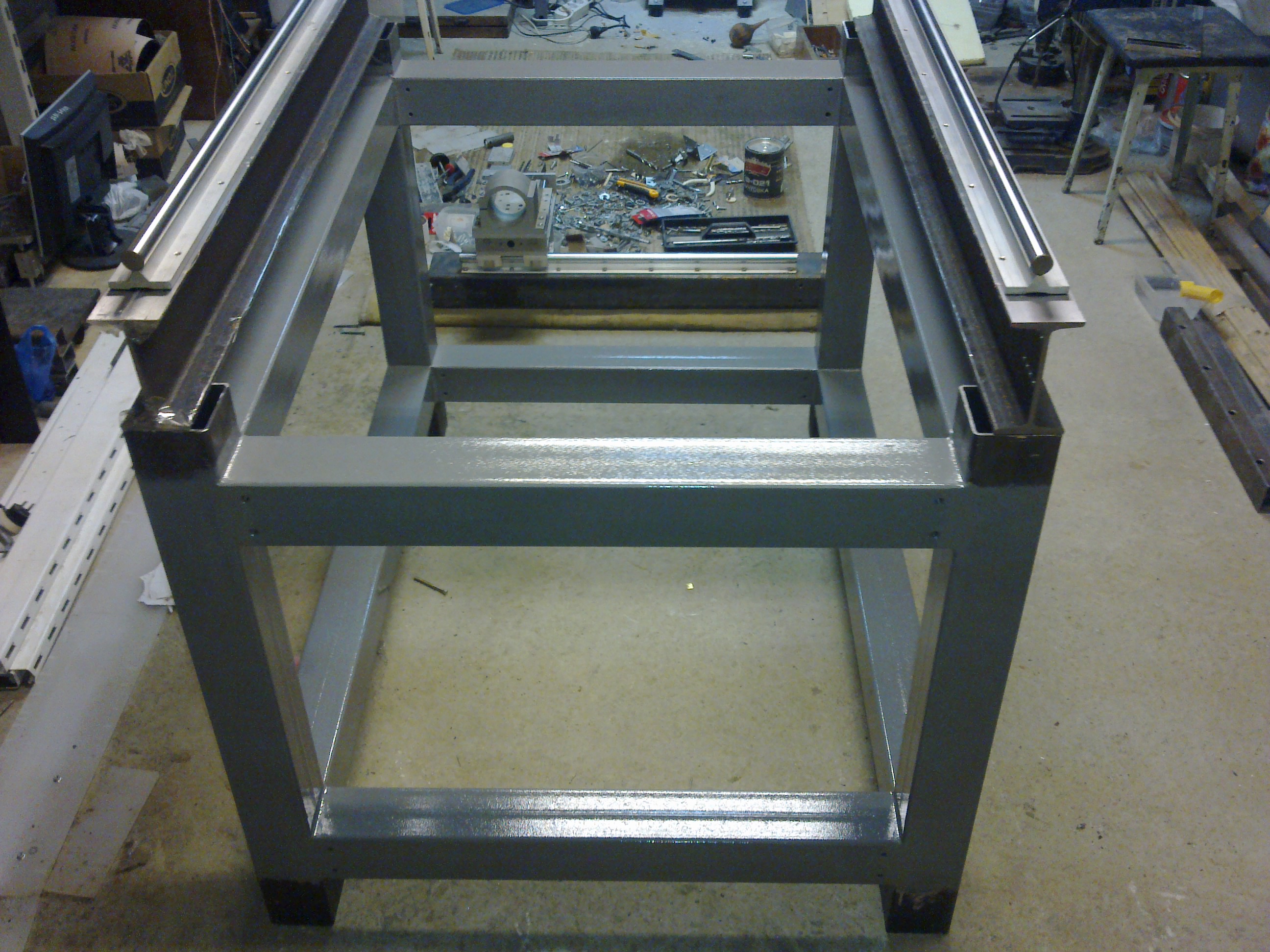 В общем намучился с болтами я. В итоге знакомый сварщик сварил мне станину, не мог он смотреть на это дело :hehehe: сначала точечно прихватками, после рихтовка :hammer: :hammer: :hammer: , дальше знакомый сварщик проваривал полосками с параллельным стыком (диагонально), после все зачистил :angle_grinder:, обработал торцы, так как железо быстро ржавеет в условия гаража, да и погода у нас дождливая, решил грунтовкой пройтись, приготовил железо для боковушек. Тяжелый хобби станочек получается :hehehe: думаю поставить колесики, рядом с регулируемыми опорами.