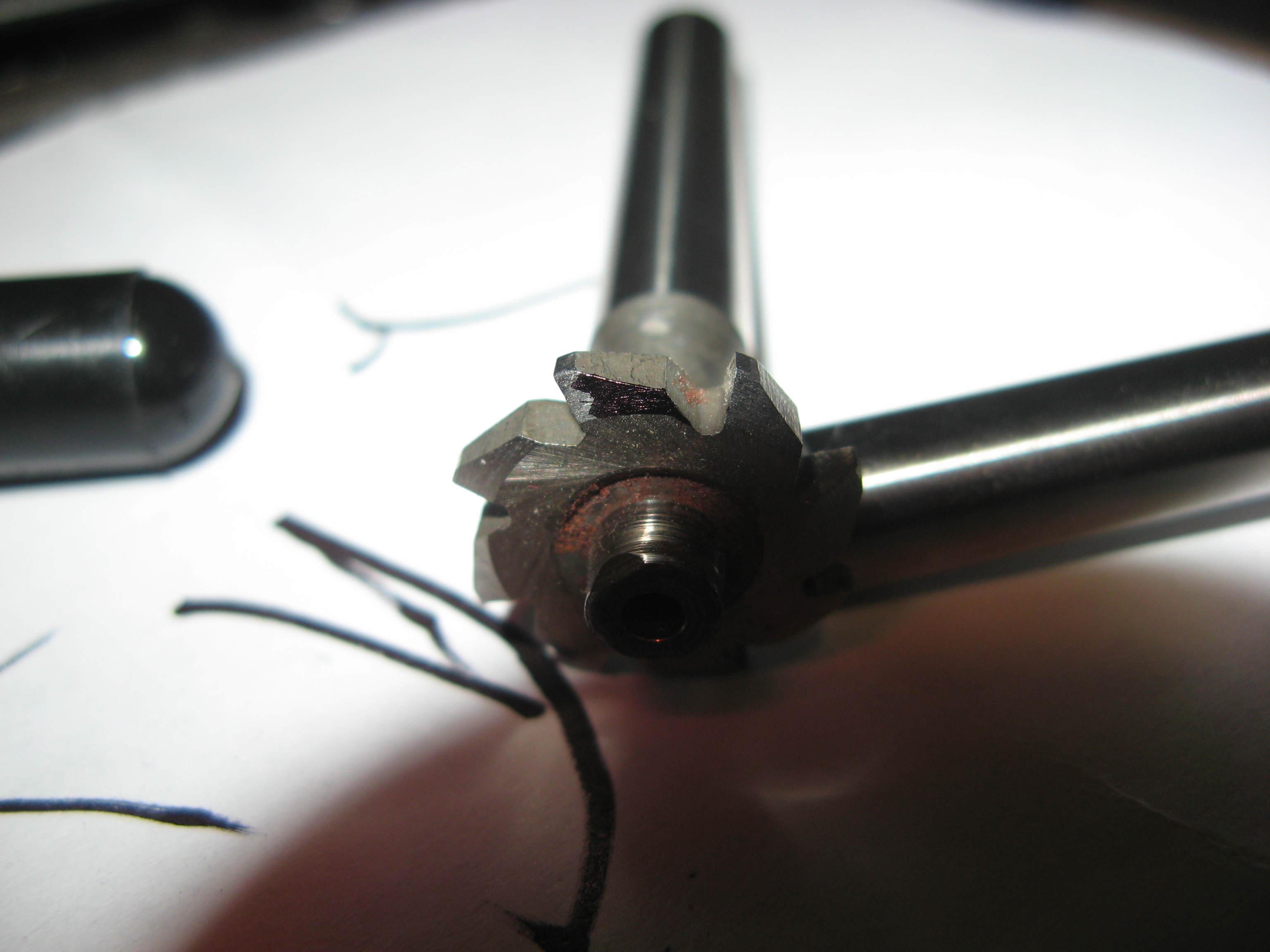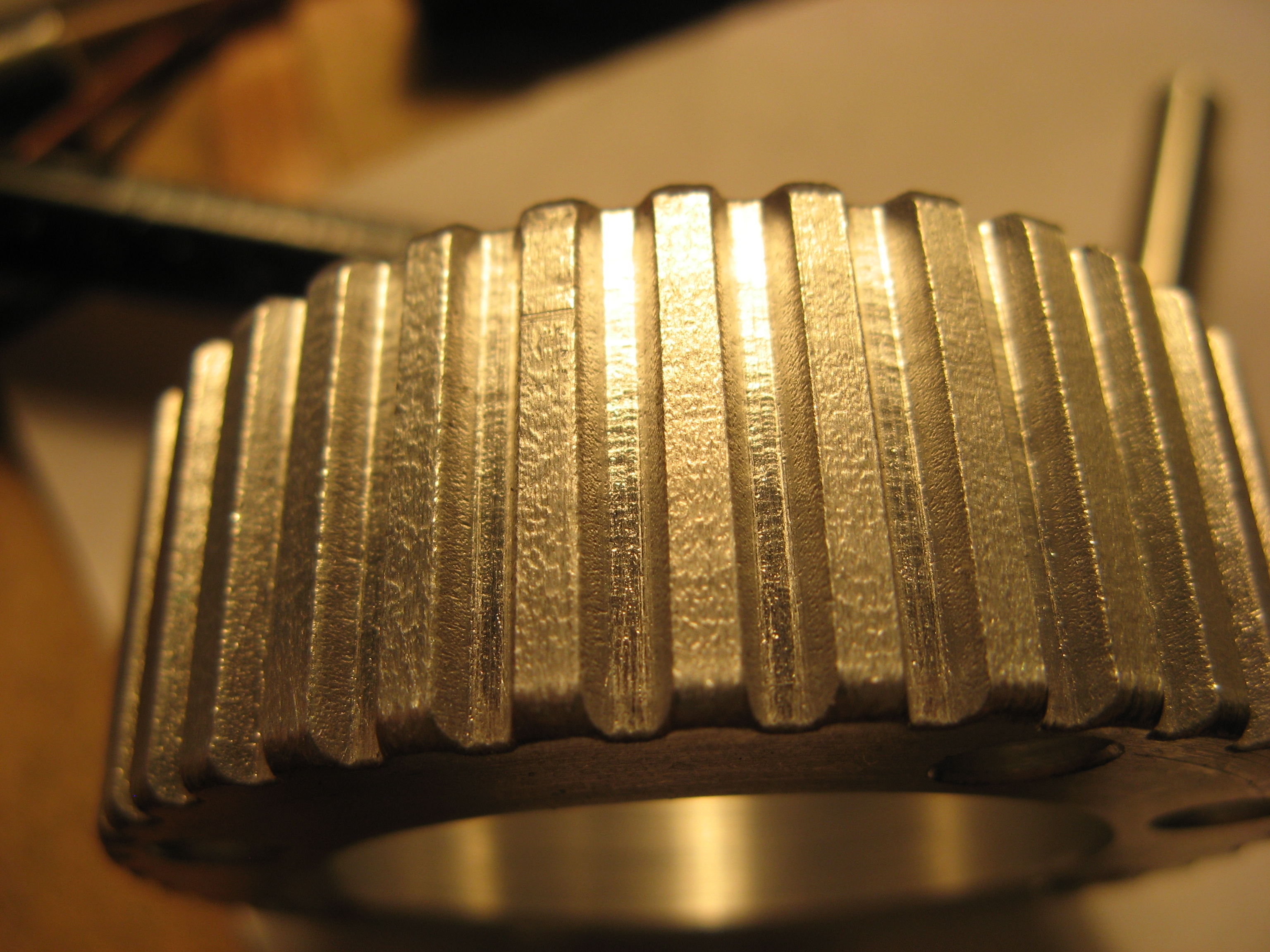смотри. фотки фрезы (заготовки) и обработанной детали. деталь правда после крацевания - следов от фрезы сильно нет. как приедут новые шкивы смогу показать без крацевания что выходит, но там тоже все впорядке. маркером отметил место где приходилось дорабатывать. оптика была нужна чтобы выдержать угол и ширину площадки - там допуски меньше чем обычно руками можно заточить или штангелем промерить. после затыловки ты поверхность видел, без нее не пробовал - не знаю. как вручную получится затыловать эвольвенту я хз, хотя можно сбить камушком ровные грани и оставить узкие полоски. в чем плюс такой фрезы - меньше диаметр, что позволяет спокойно работать на скоростных шпинделях. если задаться скоростью 60 м/мин то на ф12 выходит полторы тысячи - со стабилизацией я в такое верю, хотя уже на пределе конечно