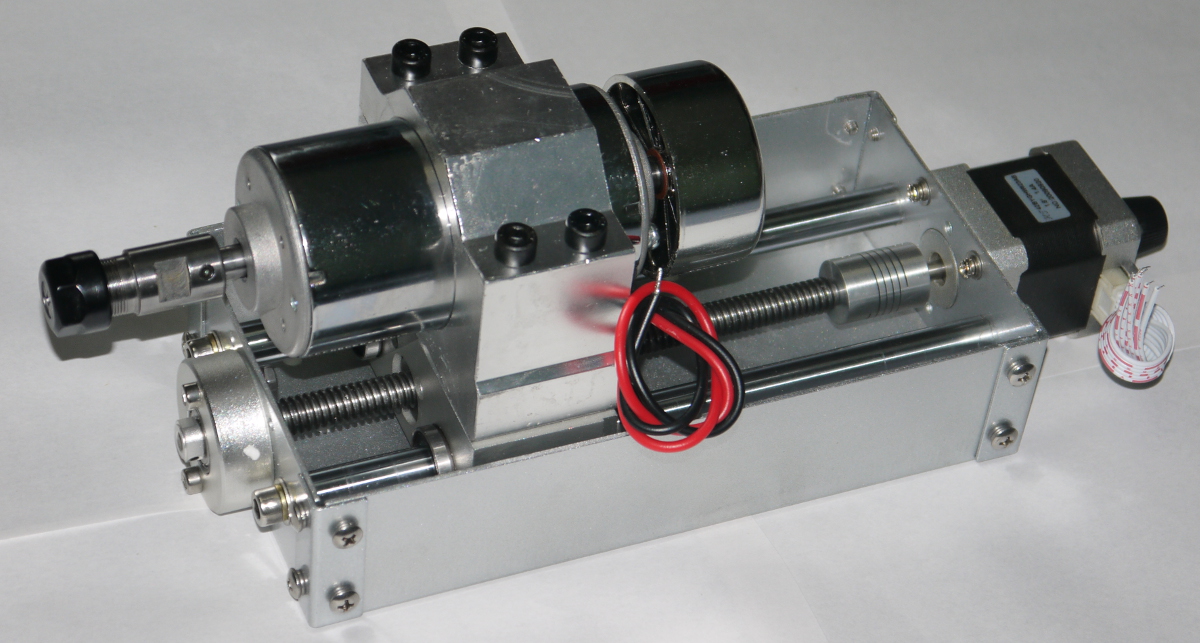 Ось Z в комплекте с ШД и коллекторным шпинделем 300 Вт, ход 14 см. Ходовые валы 12 мм, винт трапециевидная резьба диаметр 12мм шаг 2 мм, разрезная подпружиненная капроновая гайка. Коробчатый корпус согнут из листовой стали 1,5 мм, уголки усилены накладками, внешние размеры 260*100*45 мм, окрашен серебристой краской. Описание шпинделя есть выше в ветке. Ценник 6800 ( по отдельности 4100 ось 2700 шпиндель).