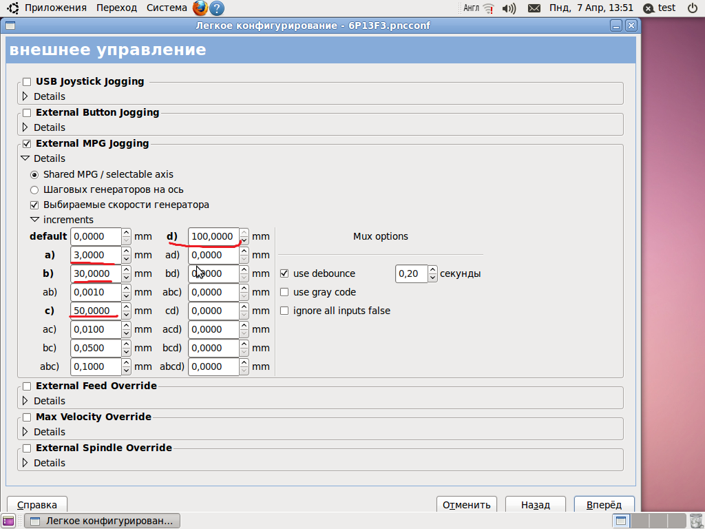 Подачи кнопкой переключаются, или там галетник? По ним в pncconf в пинах GPIO вход ищи Overrides -> Feed override A,B,C,D, параметры ABCD скорее всего потом задаются...