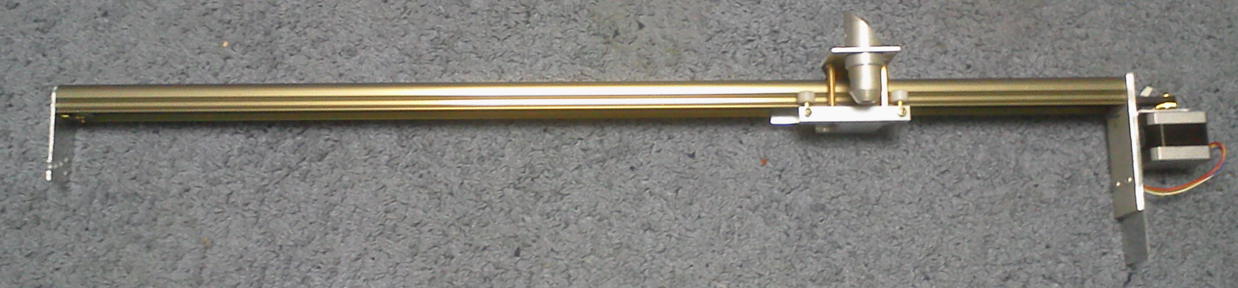 Специальный алюминиевый профиль, каретка на четырёх роликах на шарикоподшипниках, эксцентриковое крепление для регулировки. шаговый двигатель 42 мм 0,9 градуса, ток примерно 0,7 ампера, линейное перемещение 10 см/оборот. Обеспечивает скорость где то до 500 мм/сек. Стоимость 3500 рублей ( без лазерной головки, на фото для примера)