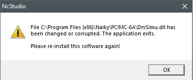 Не запускается 8-ка в режиме симуляции (NcStudio v8.258 (PCIMC-63A-53B-53C) (EN)), пишет что файл DrvSimu.dll изменен или поврежден, скрин прилагаю.