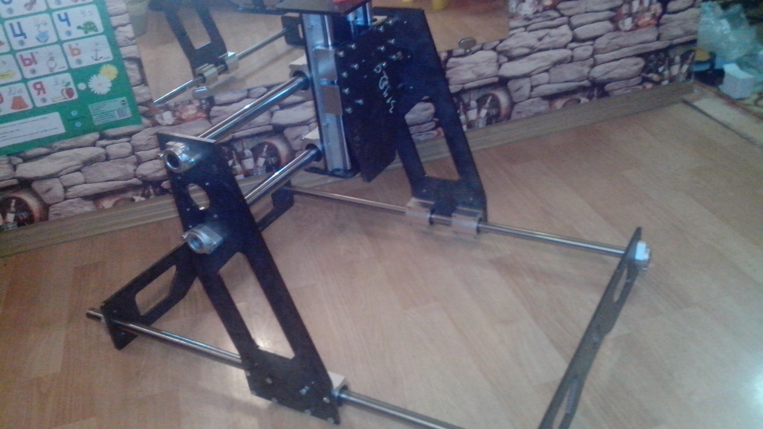 2й станок, все элементы станины были собраны из стали 6мм вырезанных на лазере. в качестве направляшек валы 20мм. винты - шпилава М14.