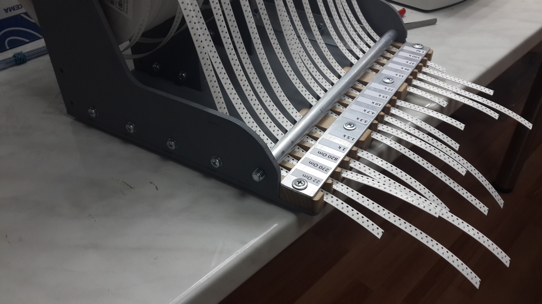 А это сделал недавно для своего монтажника стойку для катушек с SMD. Фанера 4 мм, чуть-чуть аллюминия из строительного супермаркета и небольшой буковый брусок для направляющих.