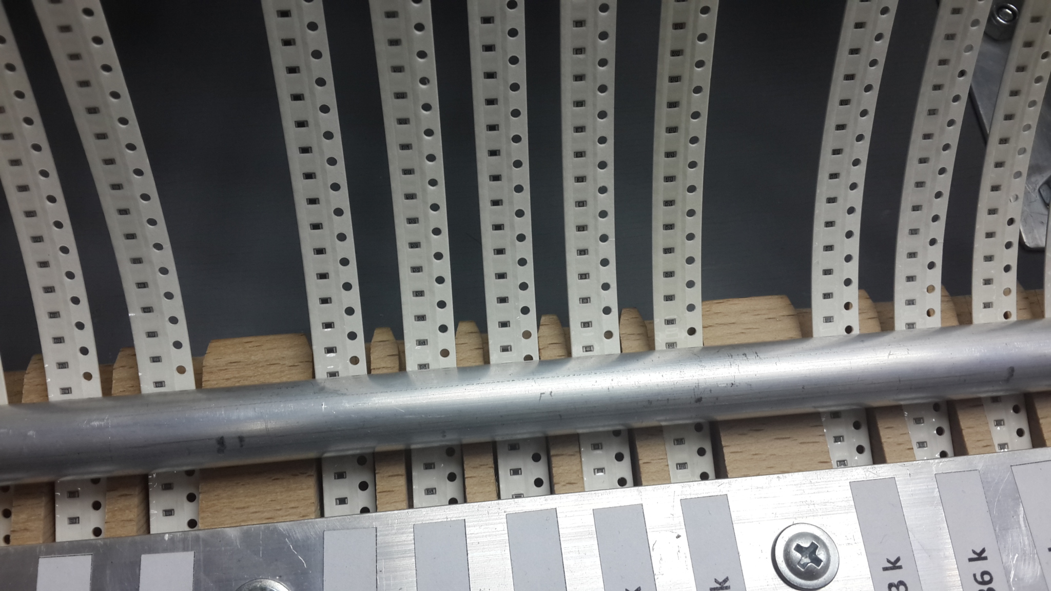 А это сделал недавно для своего монтажника стойку для катушек с SMD. Фанера 4 мм, чуть-чуть аллюминия из строительного супермаркета и небольшой буковый брусок для направляющих.