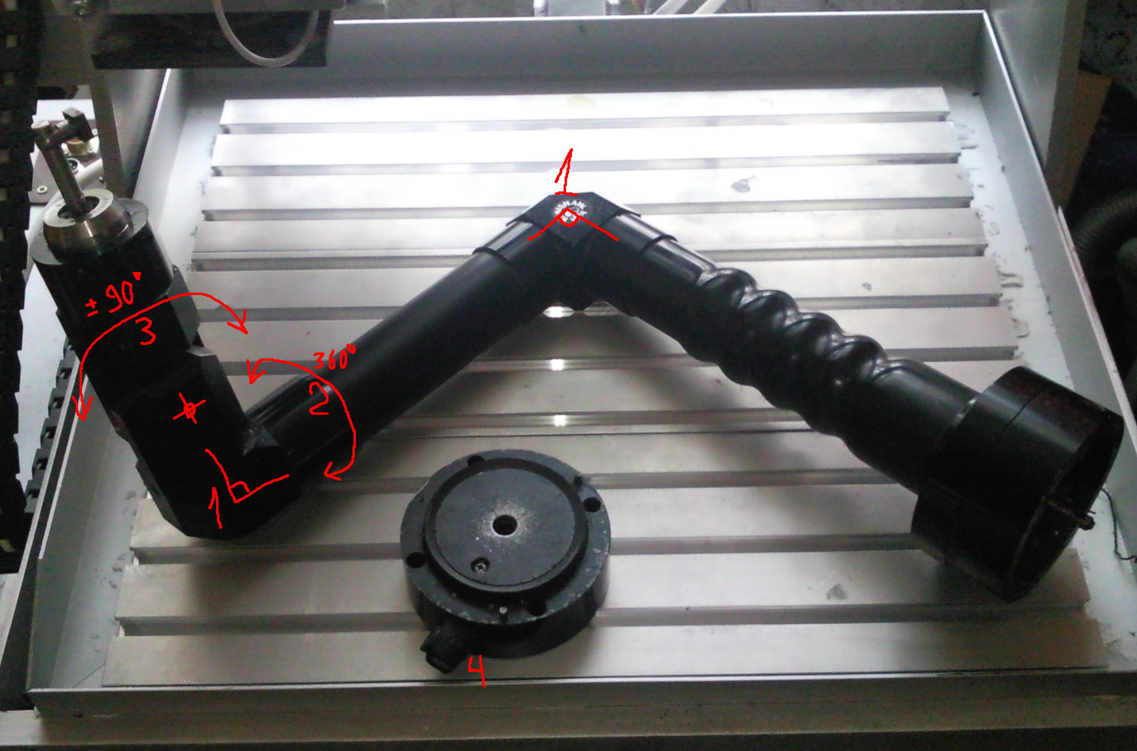 "шайба", что внизу фотки закрепляется либо на станине, либо на чём-то поворотном. сама "рука" ставится на "шайбу" и закрепляется поворотом ручки 4. Люфтов в этом соединенении нет.