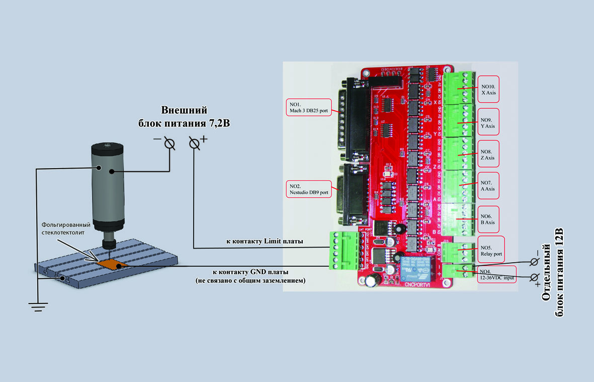3) От внешнего БП 7,2В "-" соединяю с массой, "+" к контакту "Limit" на плате, а контактную пластину на GND платы. По такой схеме у меня срабатывает и поиск "0" и поиск центра, но не навредит ли такой способ подключения электронике?