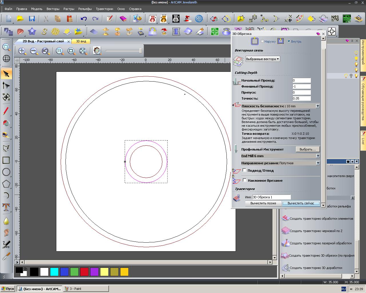 Ребята, подскажите в чем косяк. Вырезаю кольцо. Наружный диаметр 135мм внутренний 35мм. Использую 3D обрезку. Обрезка по вектору соответсвенно наружу и внутрь. Фреза 6мм. Наружный диаметр выходит 137мм. Внутренний 33мм. Приходится в программе изменять диаметры. Что делаю не так?