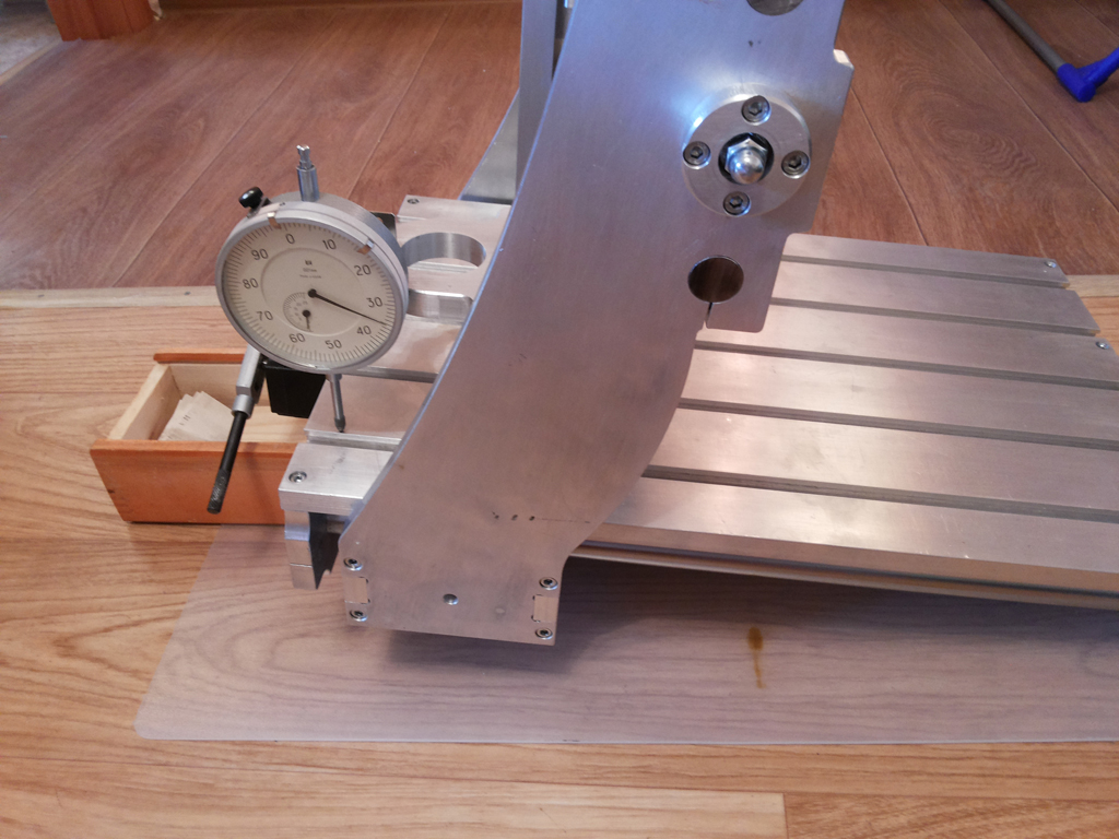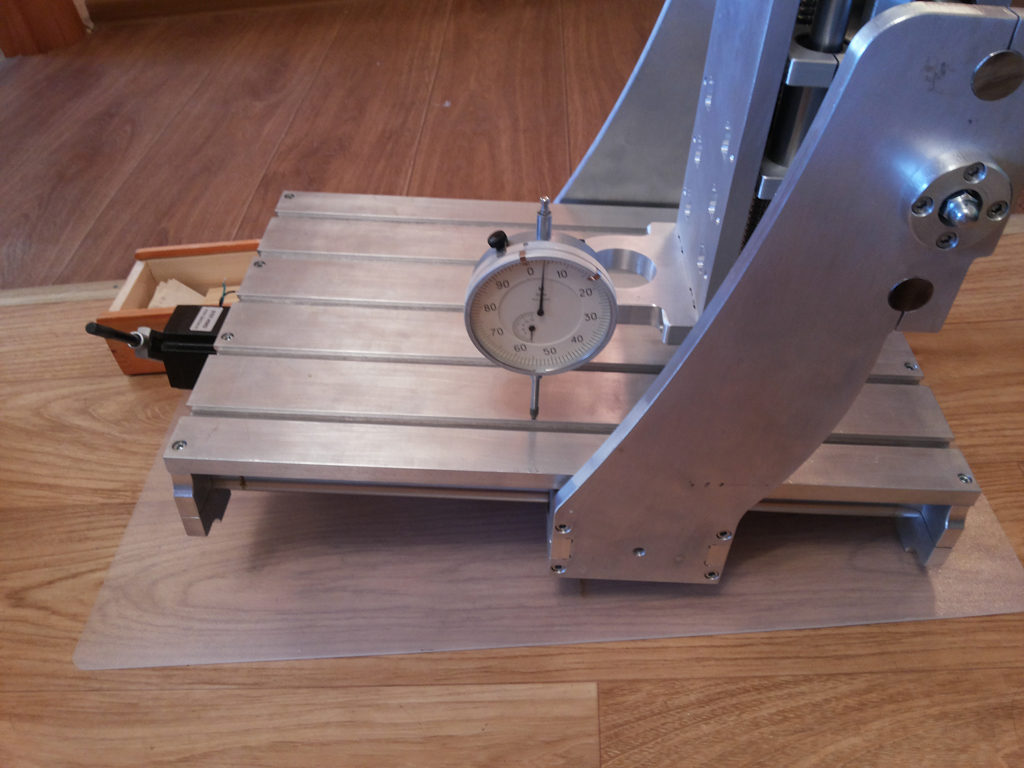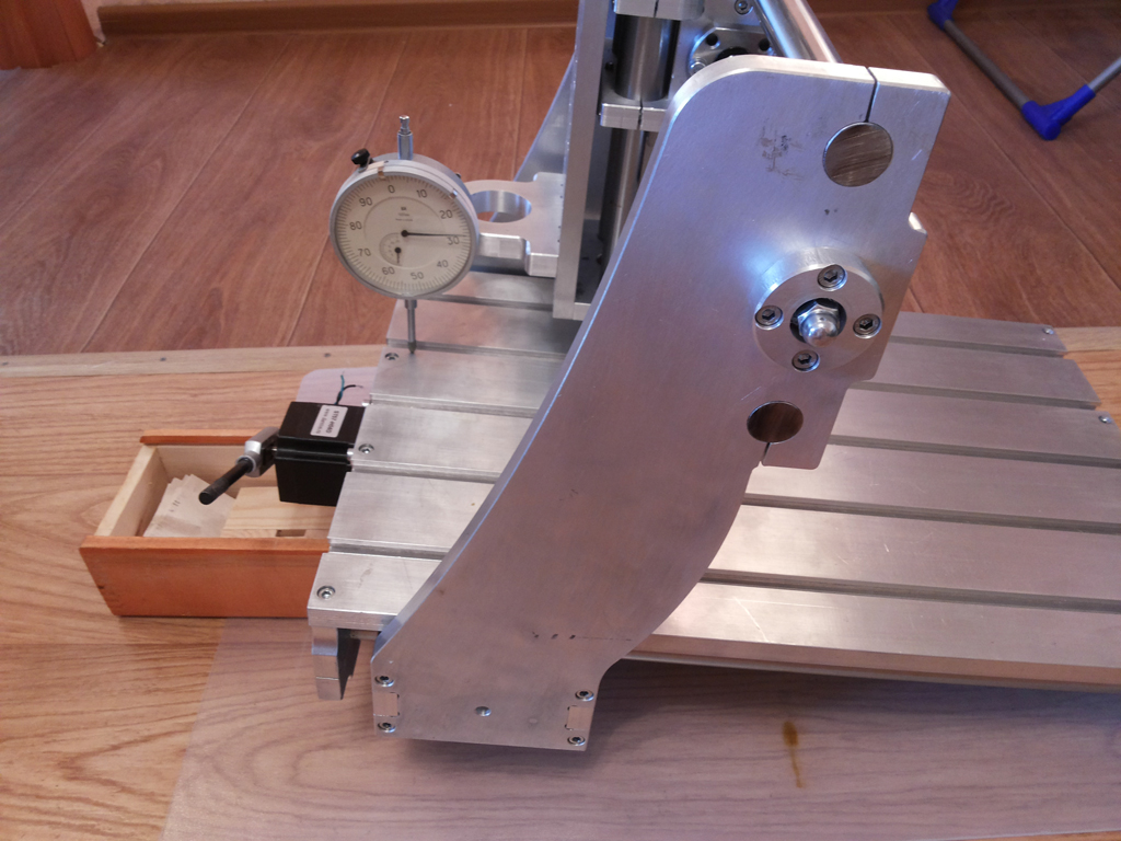 Не ясно что кривое, стол или направляшки, или установлены не совсем правильно. Ослабив винты креплений напрвляшек я чуть подправил стойки портала (видимо уставил не совсем перпендикулярно изначально, проконтролировать штангельком нет возможности, коротковат мой), после этого подтянул винты. Но если затягивать винты до упора ось уходит на 0,1мм. Ослабив немного один из винтов (буквально чуть чуть), получилось то что на фото выше.