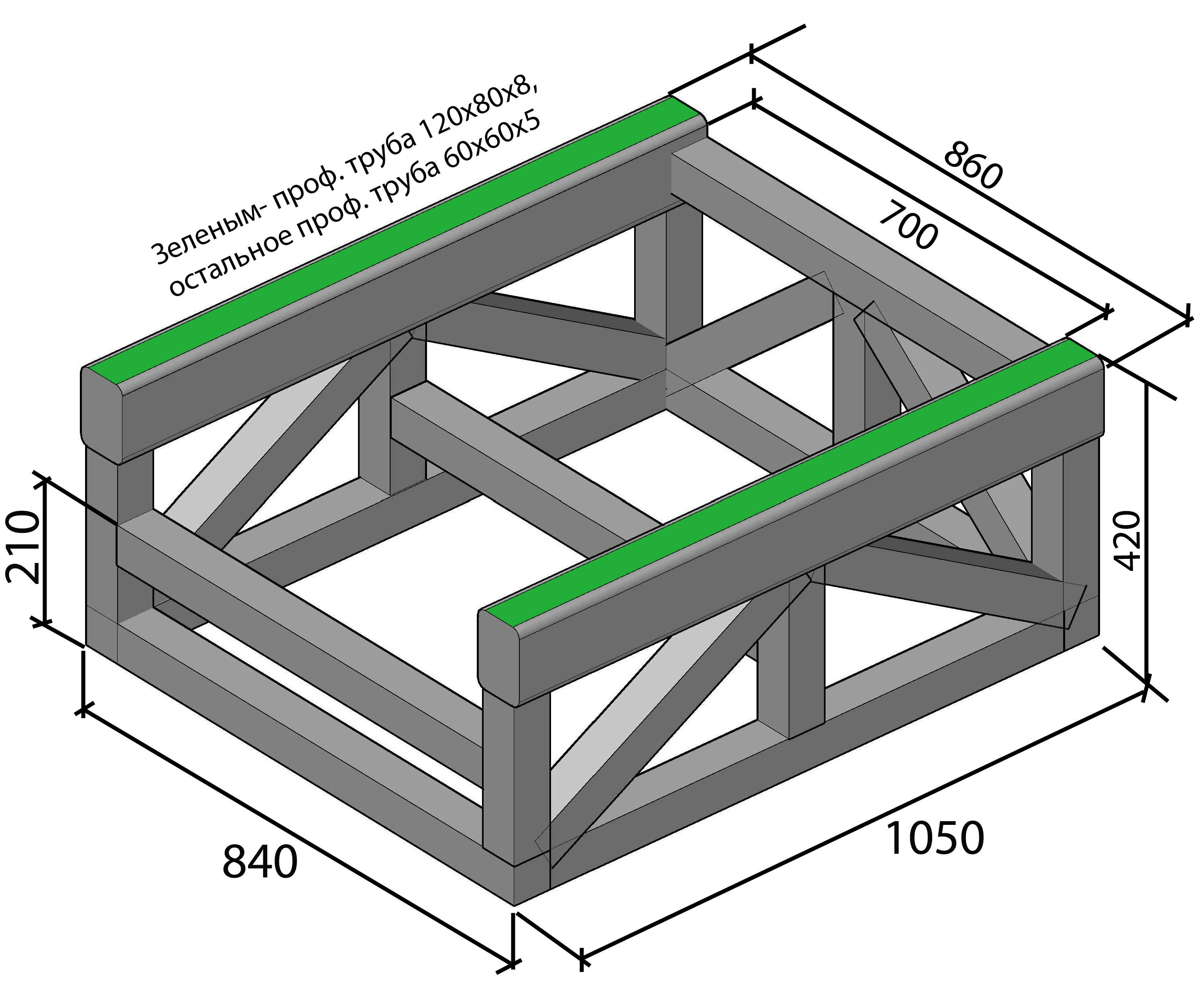 Рама из проф. Трубы 60х60х5 и 120х80х8, сейчас она уже готова и ожидает постановки на станок для выравнивания плоскости по Х (зеленым показано).