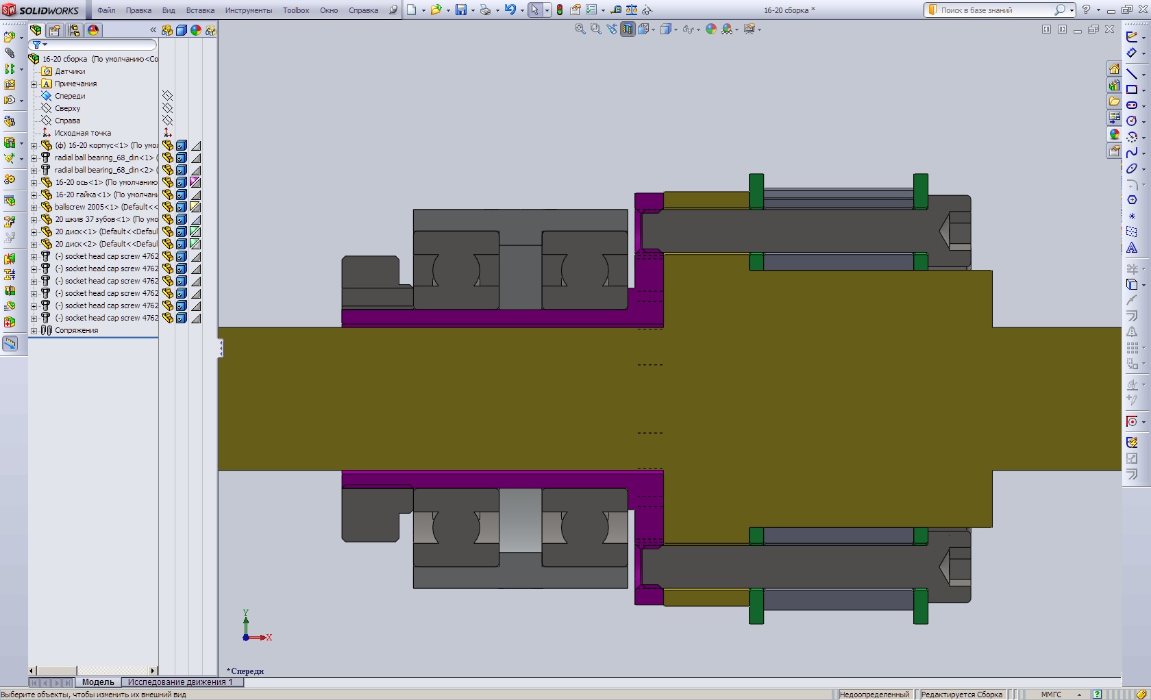 шкив одевается на гайку швп (желтый цвет) и подтягивается болтами к оси (малиновый цвет), которая вращается в корпусе на 2х подшипниках. второй шкив который на мотор ставится не показан, но думаю это итак понятно.