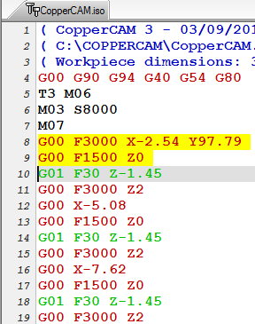 Скорость настраивается в в меню "Output data format", в меню "Active Tool" (Parameters/Selected tools...) и в "Tool Library: 2. Вопрос уже скорей по G-коду. Для сверления и гравировки используются два разных инструмента. Первым этапом идет сверление. Соответственно нужно заменить инструмент при окончании операции сверления. Замена инструмента ручная. В коде CopperCAM вставляет строчку "Т1 М06" - каким образом с помощью такой команды можно вывести станок на замену инструмента? Или же можно сделать это вот так (синий блок - окончание блока сверления, красный - то что хочу руками прописать на замену инструмента, зеленый - блок гравировки):